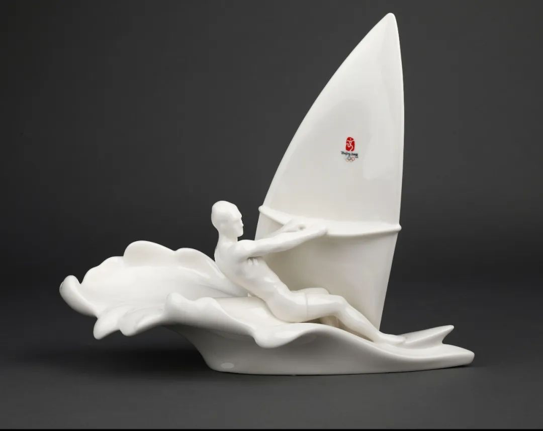 这是2008年北京奥运会运动项目系列瓷雕之帆船项目瓷雕,该系列瓷雕共有29件,寓意第29届奥运会。帆船项目瓷雕呈一名运动员操纵帆船在浪花上驰骋的造型,造型线条流畅,体现运动员律动之美感。