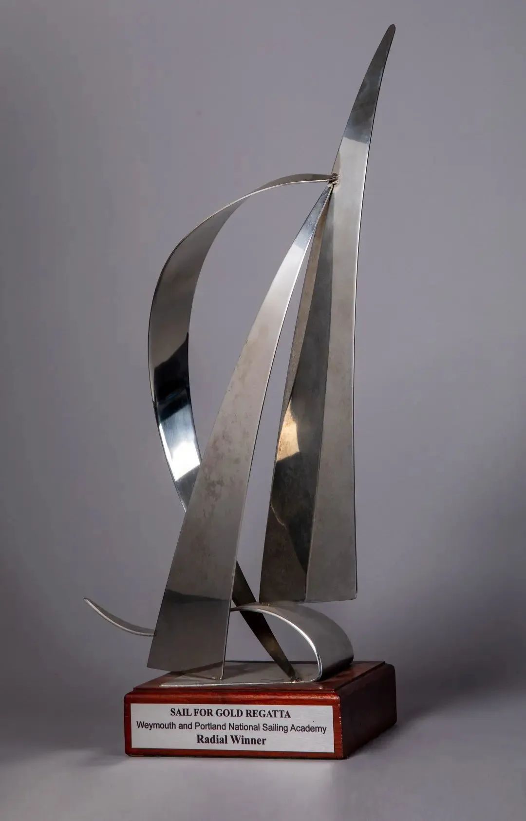 这是徐莉佳获得的英国帆船冠军赛雷迪尔级优胜奖杯。奖杯以三角和曲线组合成帆船的样式,杯座上刻有比赛名称、地点及获奖项目。
