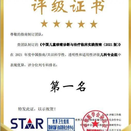近日,由我院呼吸科陆权主任医师、董晓艳主任医师主导的《中国儿童咳嗽诊断与治疗临床实践指南(2021 版)》在2021年度中国指南/共识科学性、透明性和适用性评级儿科专业组中评分位列专科排名第一名。