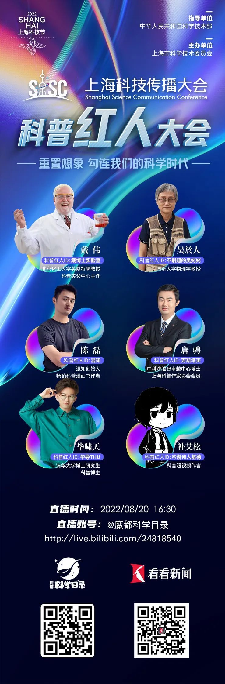 随着社交媒体成为科技传播的重要阵地,通过科普内容创作者来进行科学普及也成为了一股科技传播的新兴力量。在首届上海科技传播大会期间举办的这场科普红人大会,将邀请国内外多位新媒体科普内容创作者齐聚一堂,大家以“重置想象,勾连我们的科学时代”为题,与同样能说会道的知名主持人百克力一起打开科学魔盒,呈现科技传播新媒体的实践与真知。