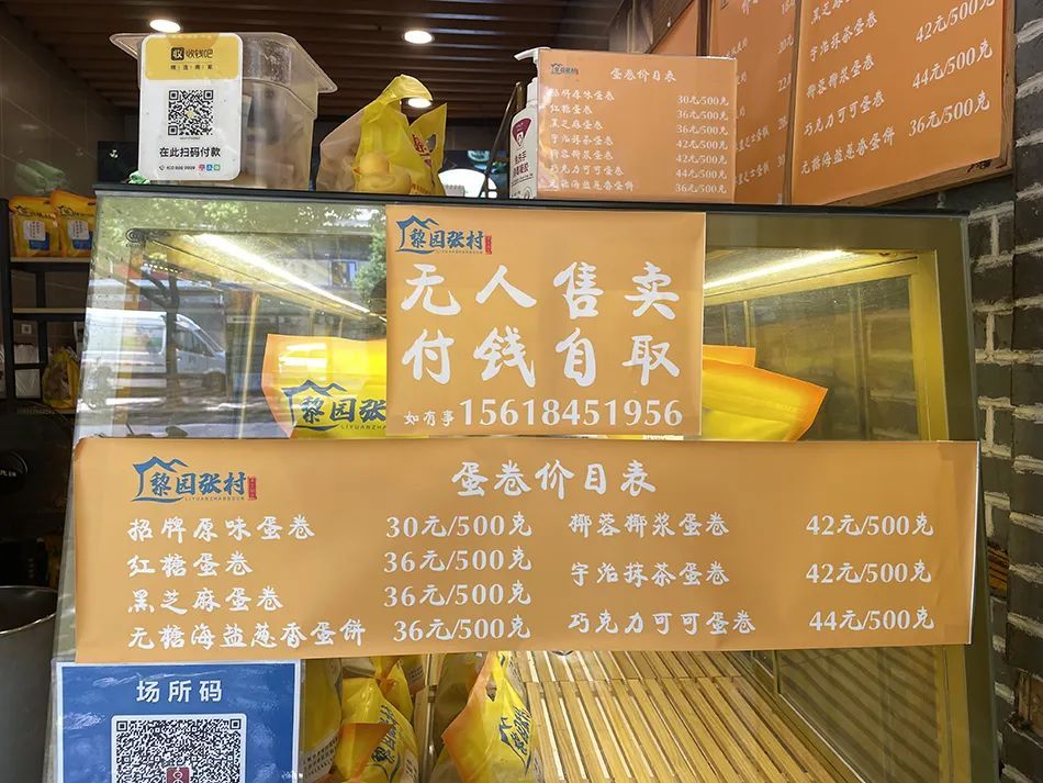 8月12日傍晚,记者来到清峪路的黎园张村蛋卷店,门口正有顾客在扫码买蛋卷。“我已经买过好几次了。”一位带着小孩的女士说,“不过,每次都来都见不到老板,我们一直是付了钱自己拿的。”说话间,她熟门熟路地扫码付款,在货架上找起红糖口味蛋卷。
