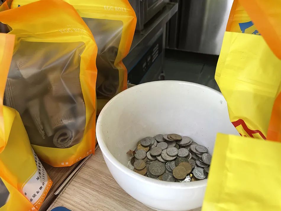 考虑到有部分老人可能更习惯用现金,我也在店门口准备了一个零钱盒子用于找零。有时店里会接到外卖预订单,遇到这种情况,我在离开小店之前,会事先把需要的蛋卷打包好放在门口,骑手到店后直接取走就行。我在蛋卷的包装袋上也留了我的手机号码,万一确有需要也可以联系。