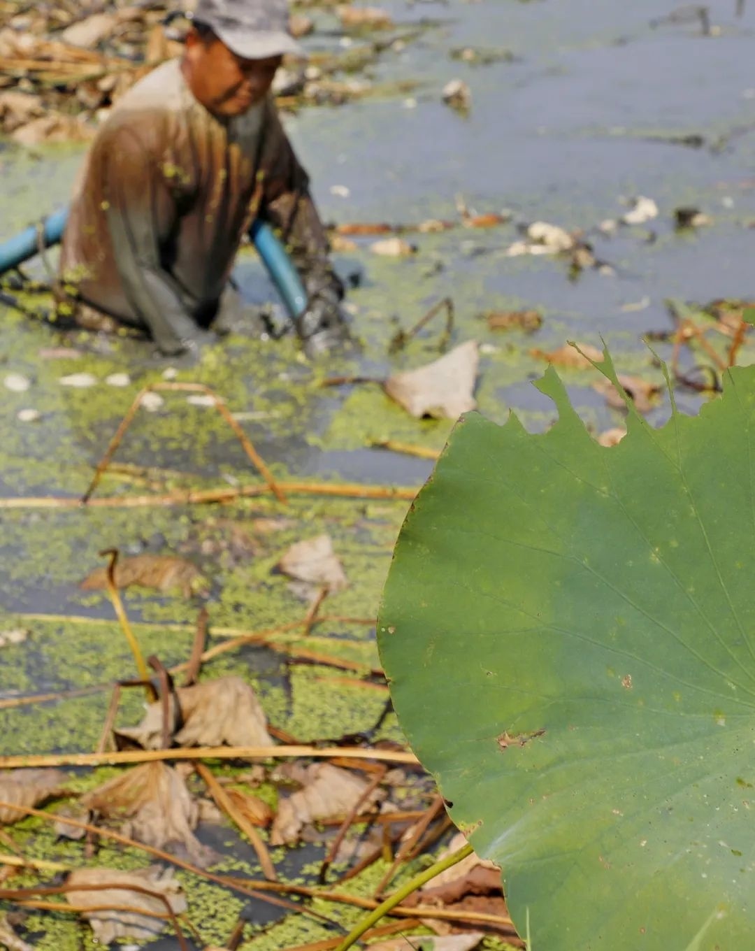 随着时间推移,水塘的温度逐渐上升,不一会李师傅已经满头汗水,胳膊上、腿上也被荷杆划出许多小口。