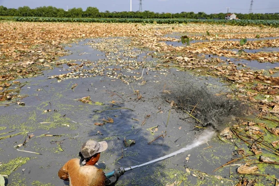 在金山区廊下镇中丰村100多亩的莲藕种植基地里,职业挖藕人们已经带好水枪下水开始一天采藕的工作。