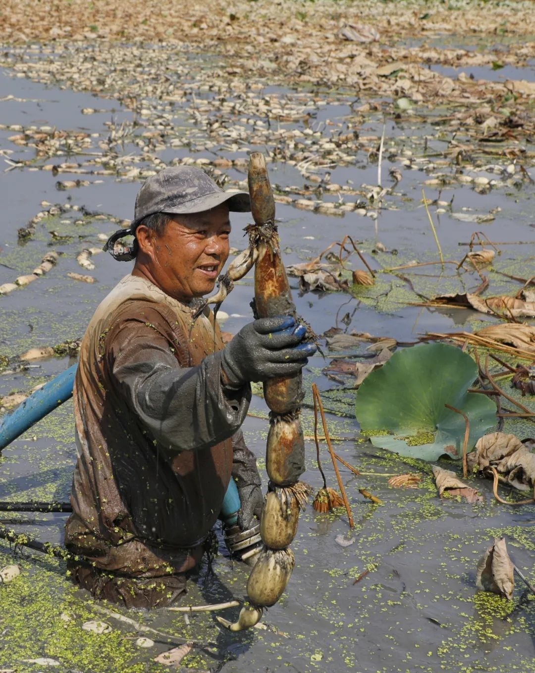 挖藕也讲一些技巧,弄得不好就断了,断掉后藕里面就进泥巴。夏天天气热,我们穿皮衣很烫,不穿皮衣的话,身体一直泡在水里,皮肤又很痒,而且春夏季荷杆在水里烂不掉,会刺得很痛。