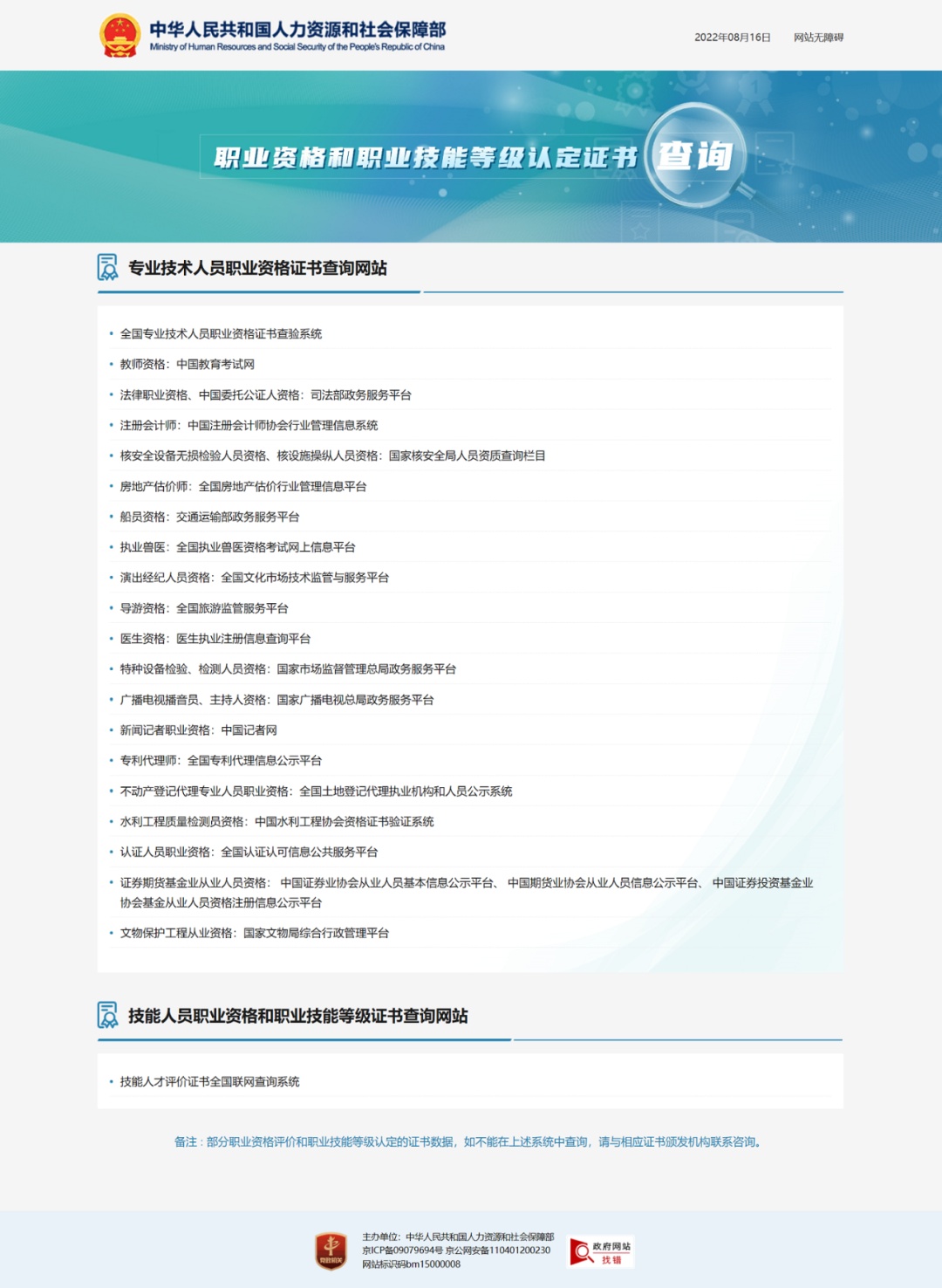 近日人力资源社会保障部在其门户网站开设“职业资格和职业技能等级认定证书查询”专栏,公布了20个专业技术人员职业资格证书查询网站和技能人才评价证书全国联网查询系统。广大专业技术人才、技能人才可通过官方渠道查询职业资格和职业技能等级证书,避免上当受骗。详见↓
