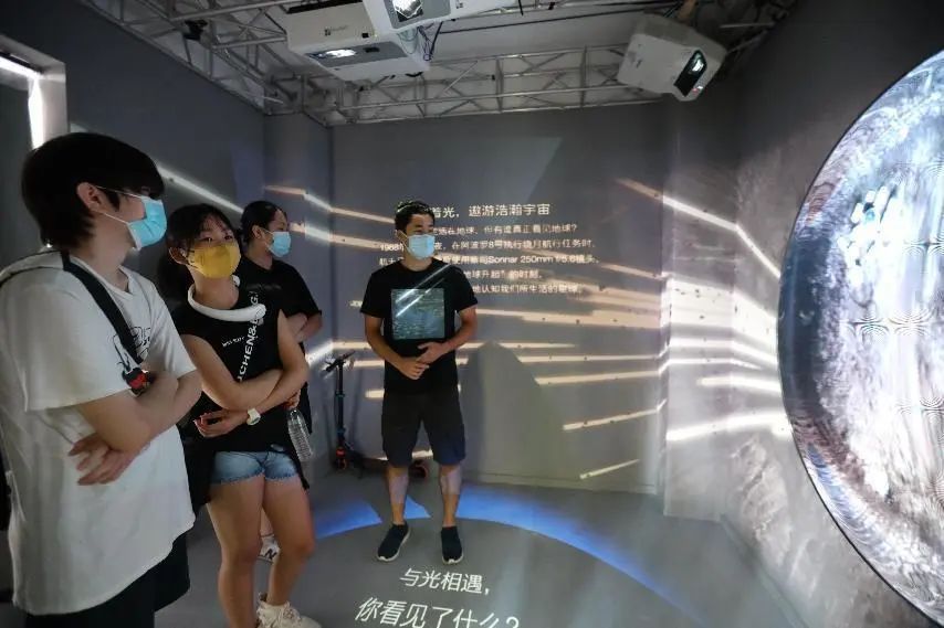 孩子和家长们首先参观了在瑞金科学生活馆举办的蔡司近视防控科普展。炫丽的光影互动体验和深入浅出文字图片与互动装置,让家长和孩子们了解了光学与眼健康科普知识,以及近视防控的重要意义。馆内的专业工作人员还为大家提供日常生活中的近视防控行为指导。