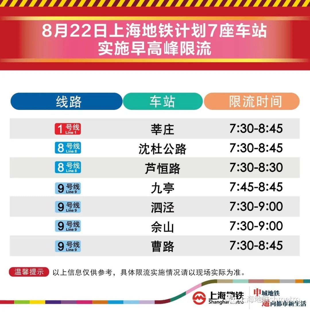 8月22日,上海地铁早高峰限流措施将继续实施,届时将有7座地铁站早高峰计划限流。