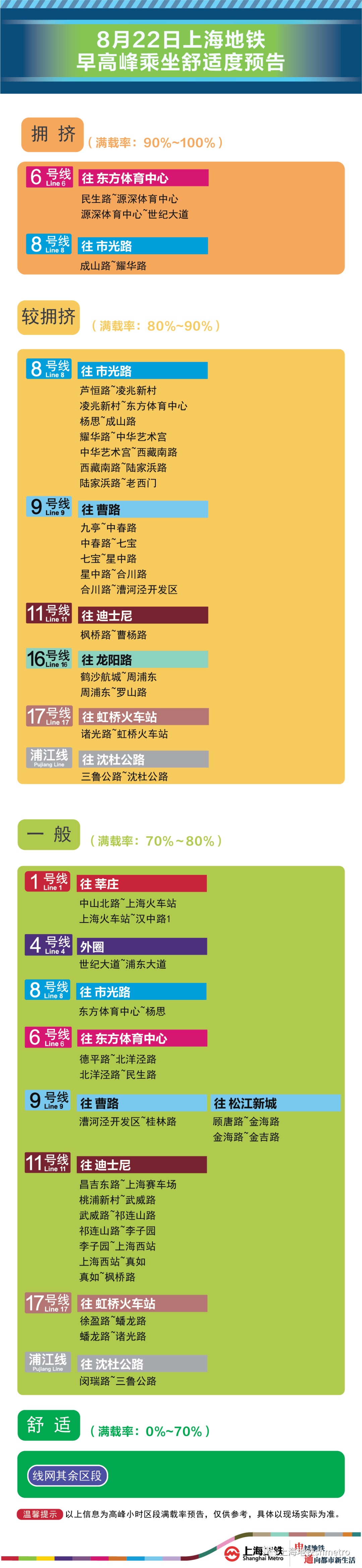 为提升上海地铁早高峰期间出行服务水平,提升乘客乘坐体验,上海地铁向乘客提供乘坐舒适度预告,方便乘客提前做好出行准备。