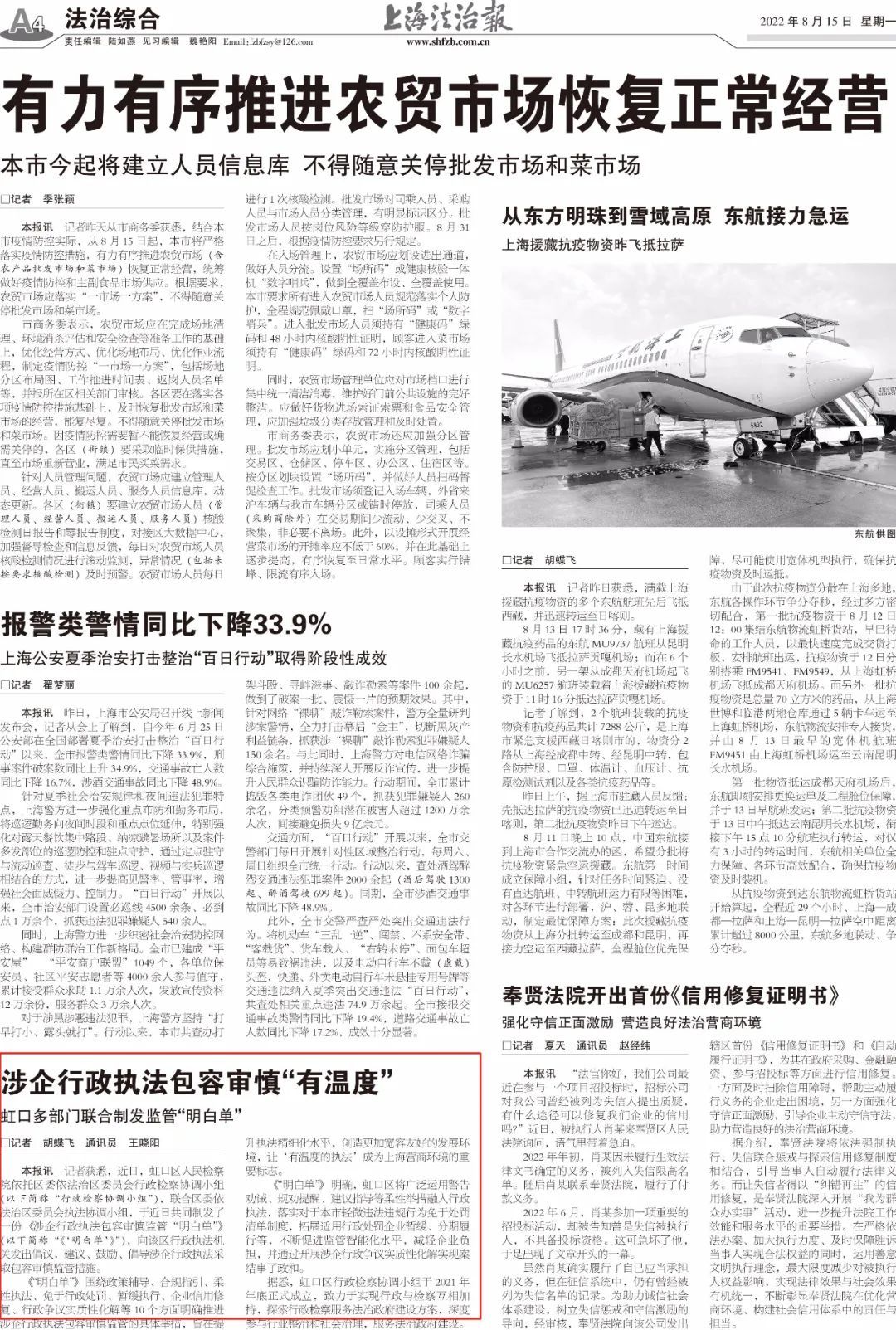 《“明白单”》明确,虹口区将广泛运用警告劝诫、规劝提醒、建议指导等柔性举措融入行政执法,落实对于本市轻微违法违规行为免于处罚清单制度,拓展适用行政处罚企业暂缓、分期履行等,不断促进监管智能化水平,减轻企业负担,并通过开展涉企行政争议实质性化解实现案结事了政和。
