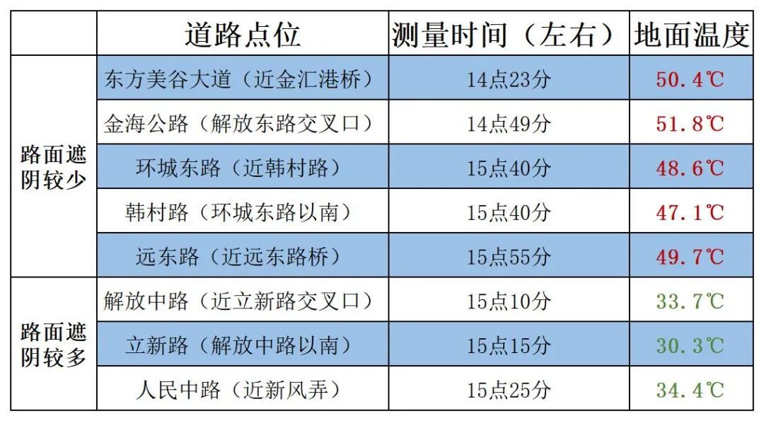 那么,如果市民步行在马路上,路面的实际温度如何?随后,小编相继来到东方美谷大道、金海公路、解放中路、立新路、人民中路、环城东路、韩村路、远东路等不同路幅及覆阴条件的路段,记录了不同时间段路面的温度情况。