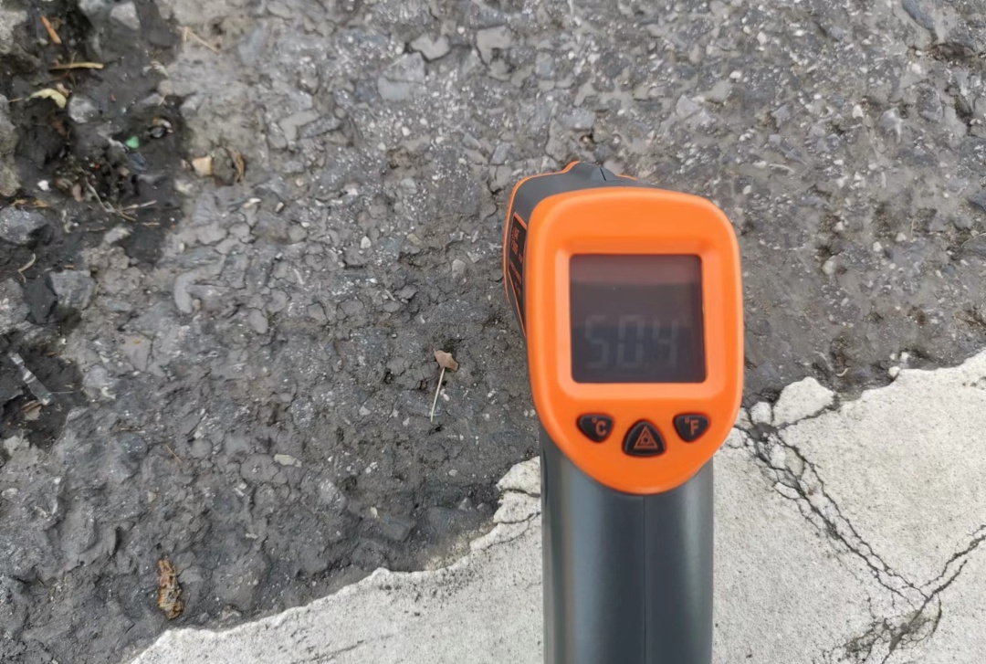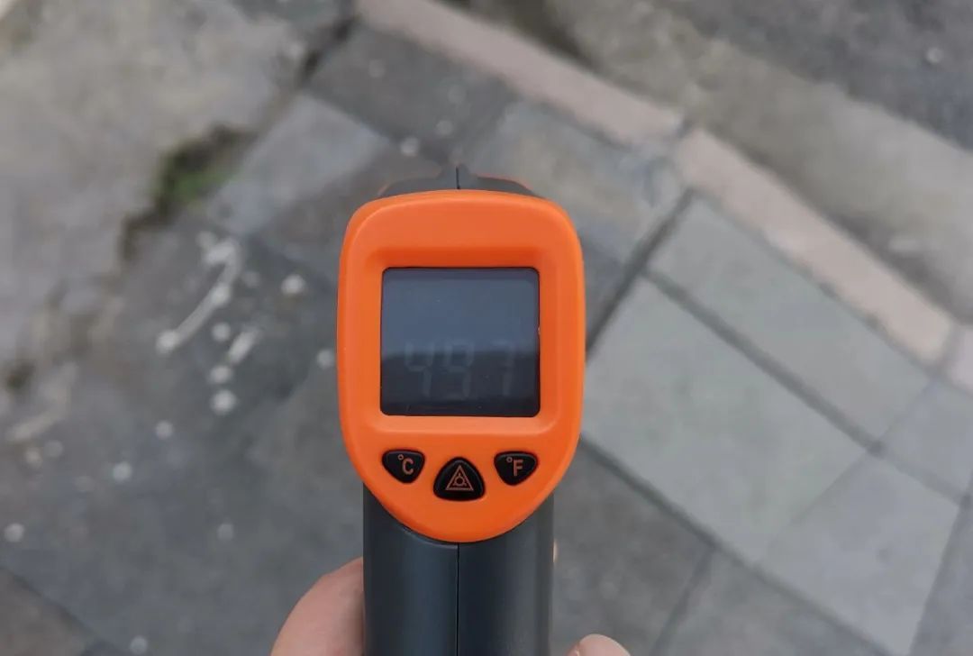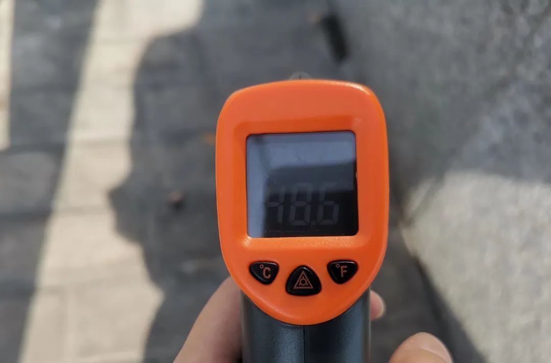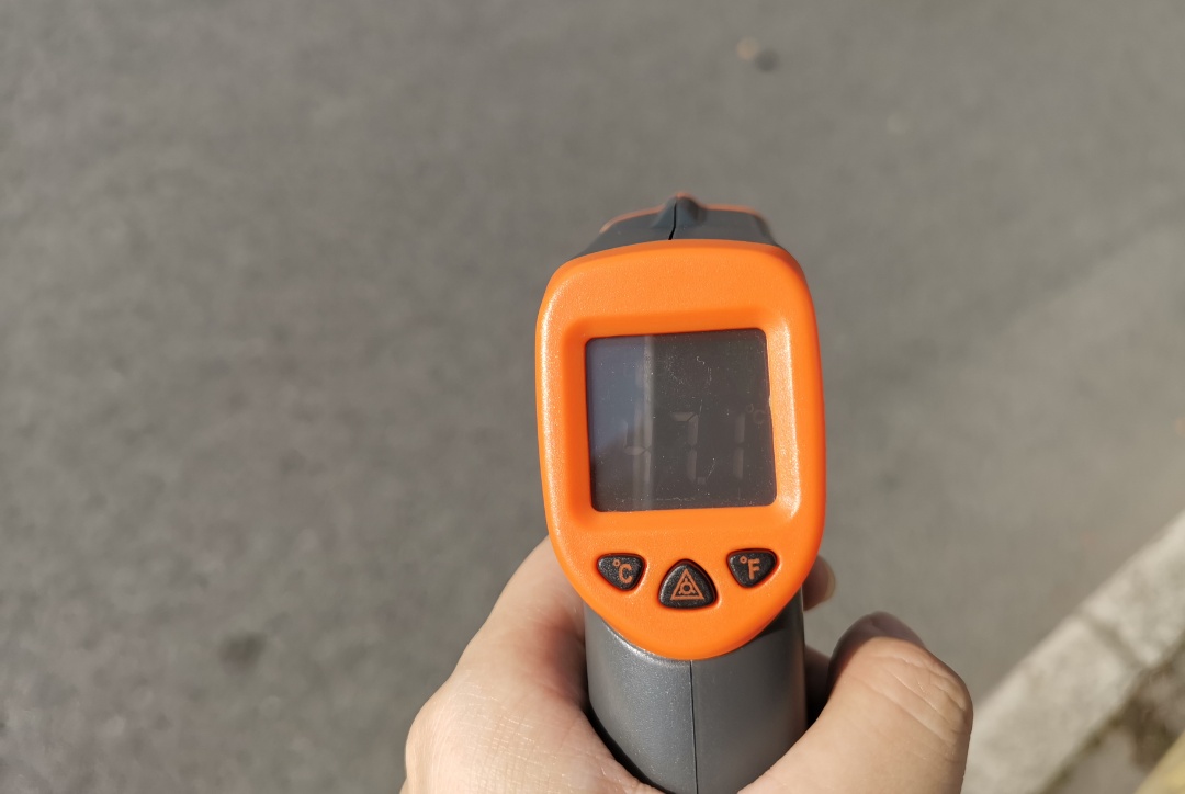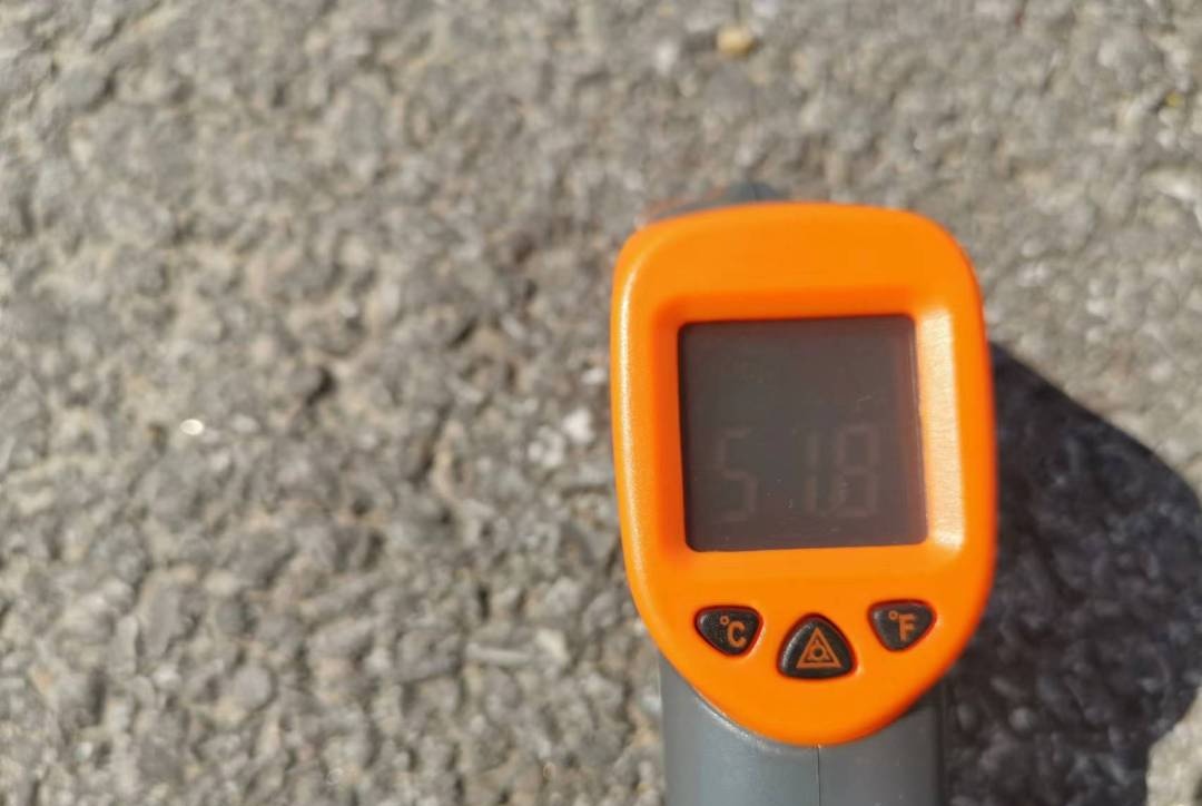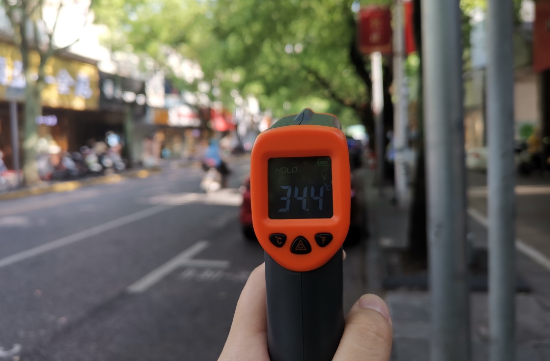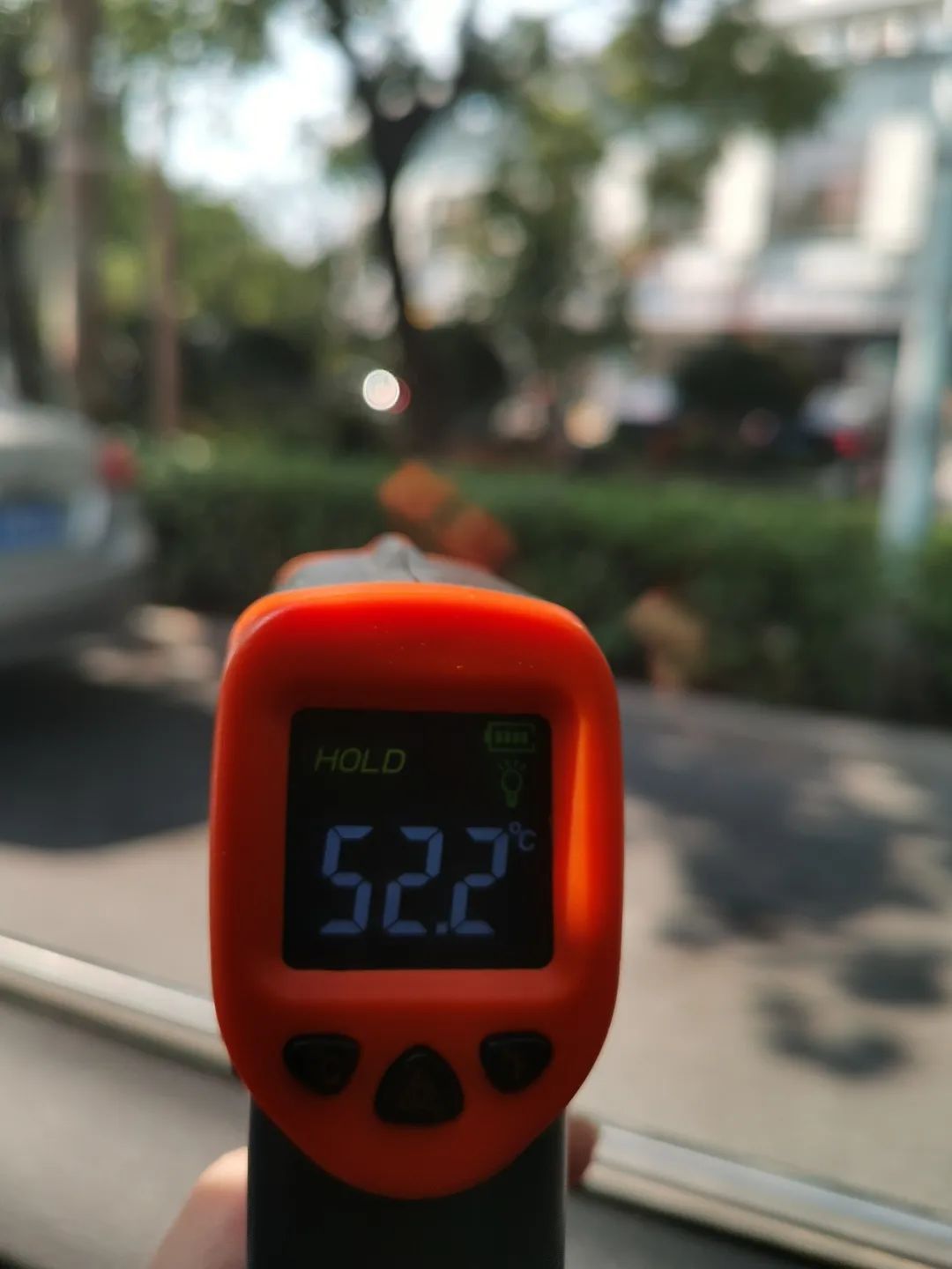 8月18日上午11点41分,奉贤气象台发布了高温黄色预警,当天奉贤大部分地区最高温度超35℃。下午2点左右,小编带着测温枪从解放东路出发了,而当小编将测温枪伸出车窗外,对准了车水马龙的道路正中央,测温枪显示温度高达52.2℃。