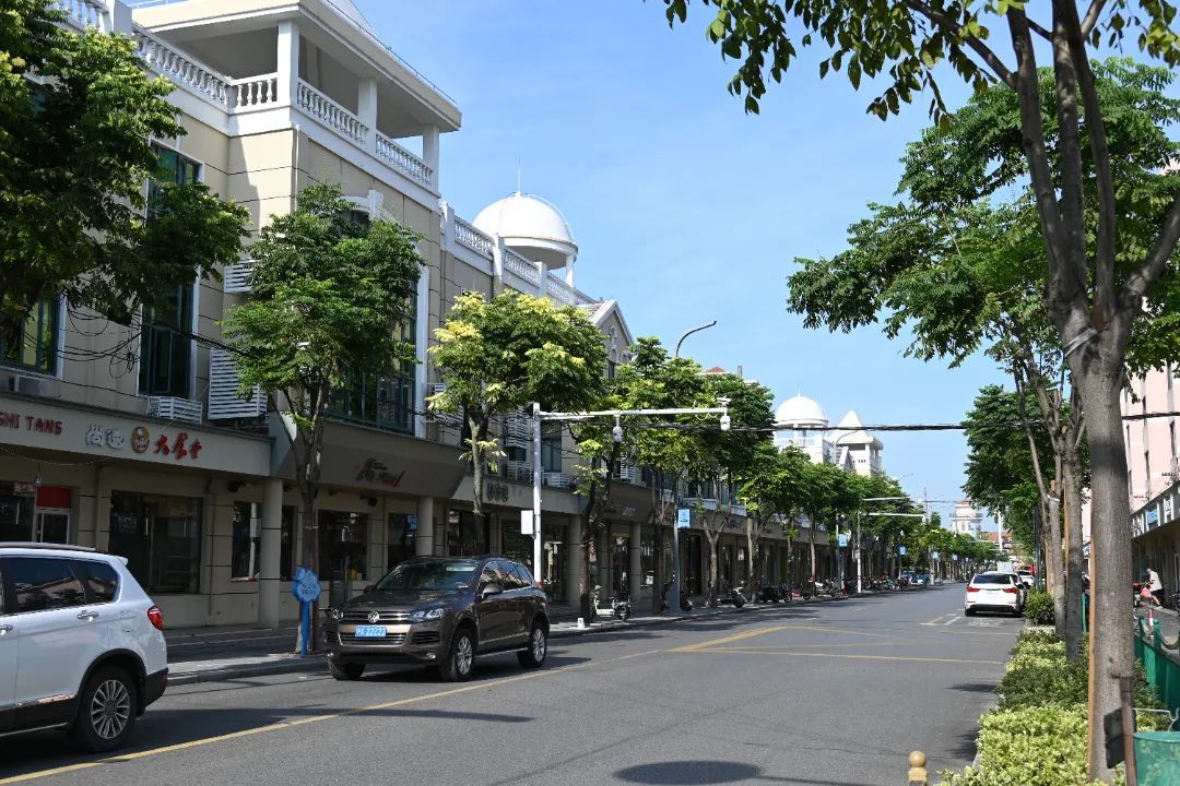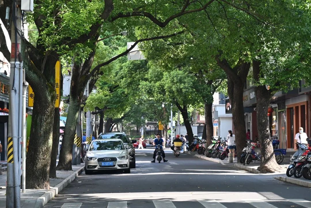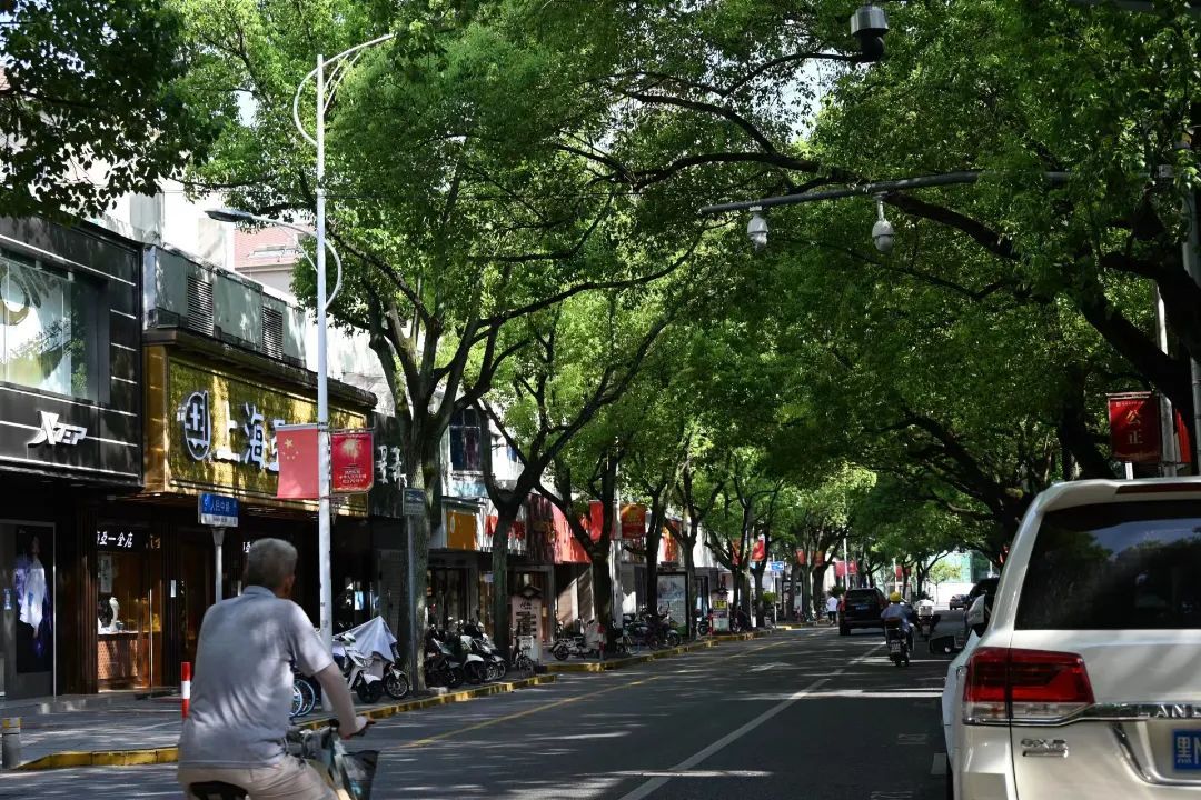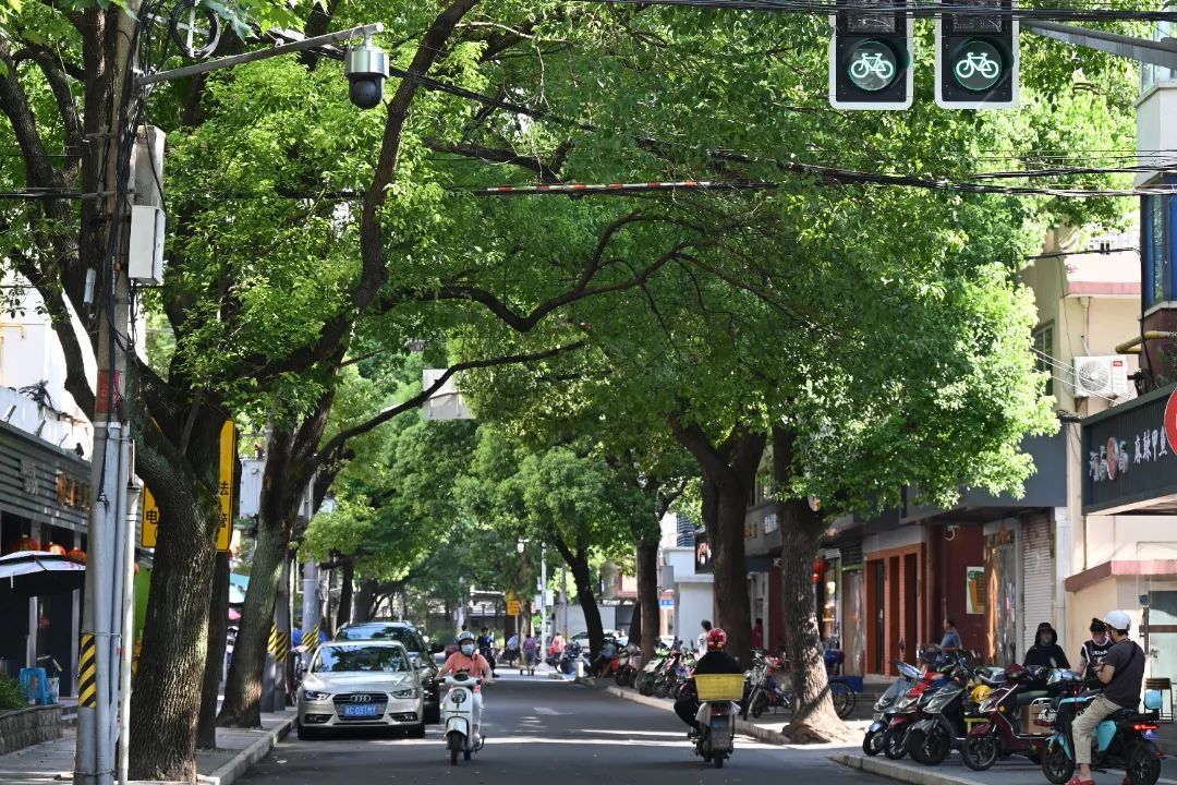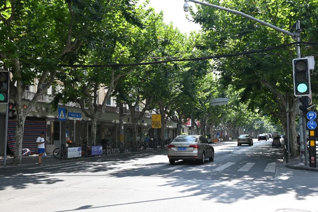 相比较各主干道,城市道路的温度洼地非南桥老城区莫属,在相对较窄的路幅之上,经年养成的行道树香樟与悬铃木等可谓“遮天蔽日”,树荫之下,清风徐来,为行人觅得一丝清凉的同时,也将路面的温度拉到与奉贤的平均最高温度持平,甚至更低水平。
