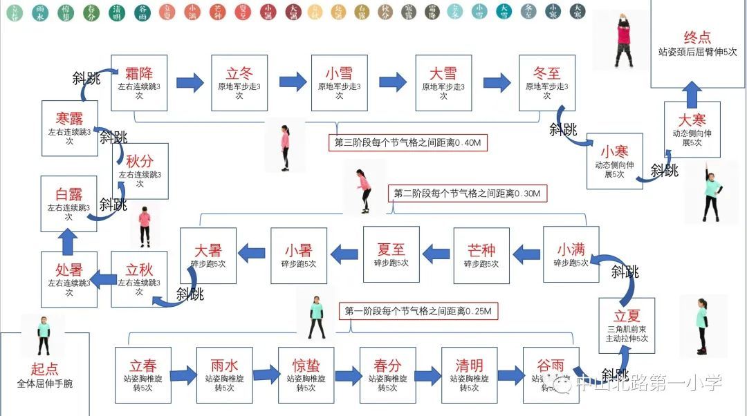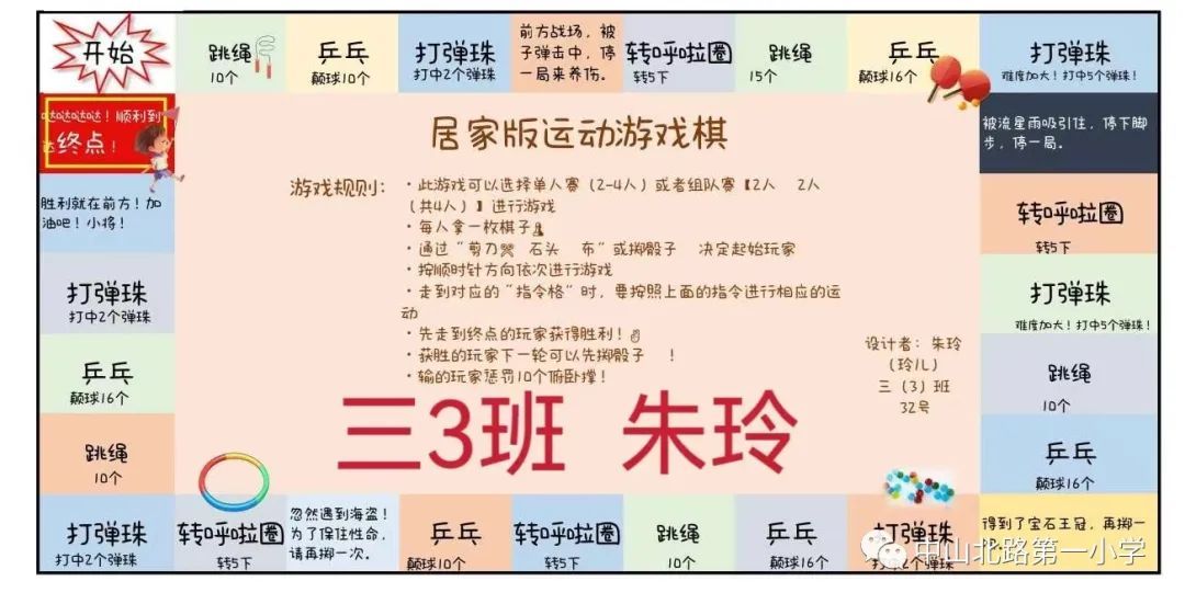 将棋子放在起点处,投掷骰子得到步数。棋子前进到相应的位置后,需要做对应的运动,比如高抬腿30次、跳绳50次、蛙跳10次等等……