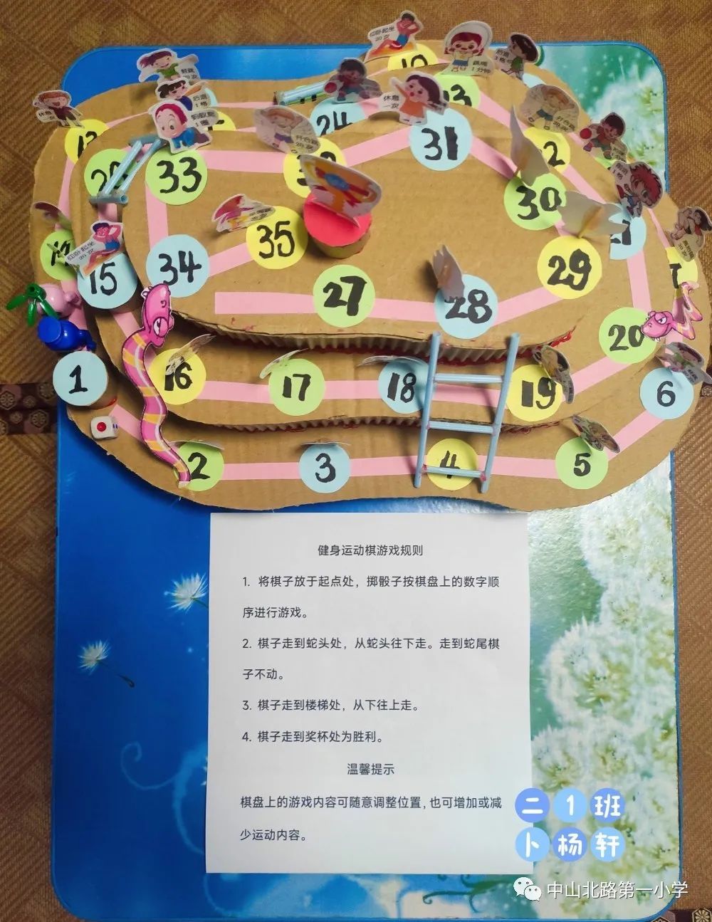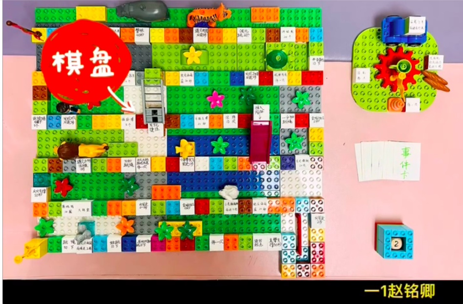 孩子们利用手中的硬纸板、积木等设计出棋盘,还结合二十四节气、哈利波特、北京冬奥会、懒狗星球等有趣的主题,游戏设定和规则制定也十分天马行空。