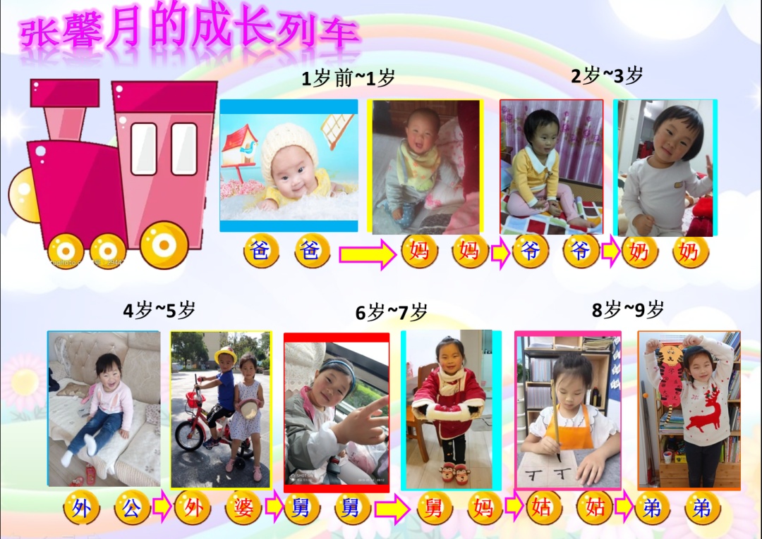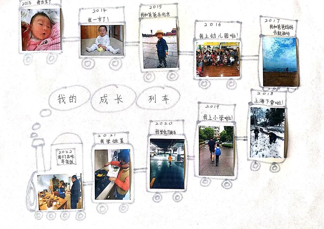 假期里,孩子们还进行了一次特殊的成长历程探寻之旅:与家人一起回顾自己的成长照片,交流成长故事,绘制自己独一无二的“成长列车”;还有孩子欣赏绘本故事,创作成长小诗,在纸笔间写下自己对成长的理解和感悟。