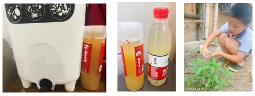 三(3)班的学生蒙敬泽这个暑假体验了一把“堆肥”的快乐。一天,妈妈买了一个堆肥桶回来。当天晚上,就把家里的厨余和餐后的西瓜皮都切小,一股脑倒进堆肥桶,再均匀喷上菌液。一周后,他迫不及待地打开堆肥桶龙头,一股微微发酸的液体流入瓶底,接了满满一瓶肥液。之后,蒙敬泽按说明书1:10稀释后,给他之前种下的辣椒苗和黄瓜苗浇上营养液。“自从有了这个堆肥桶,家里的厨余垃圾基本没有了,全家进入到更加绿色低碳的生活模式。保护环境,从一点一滴做起。”蒙敬泽说。