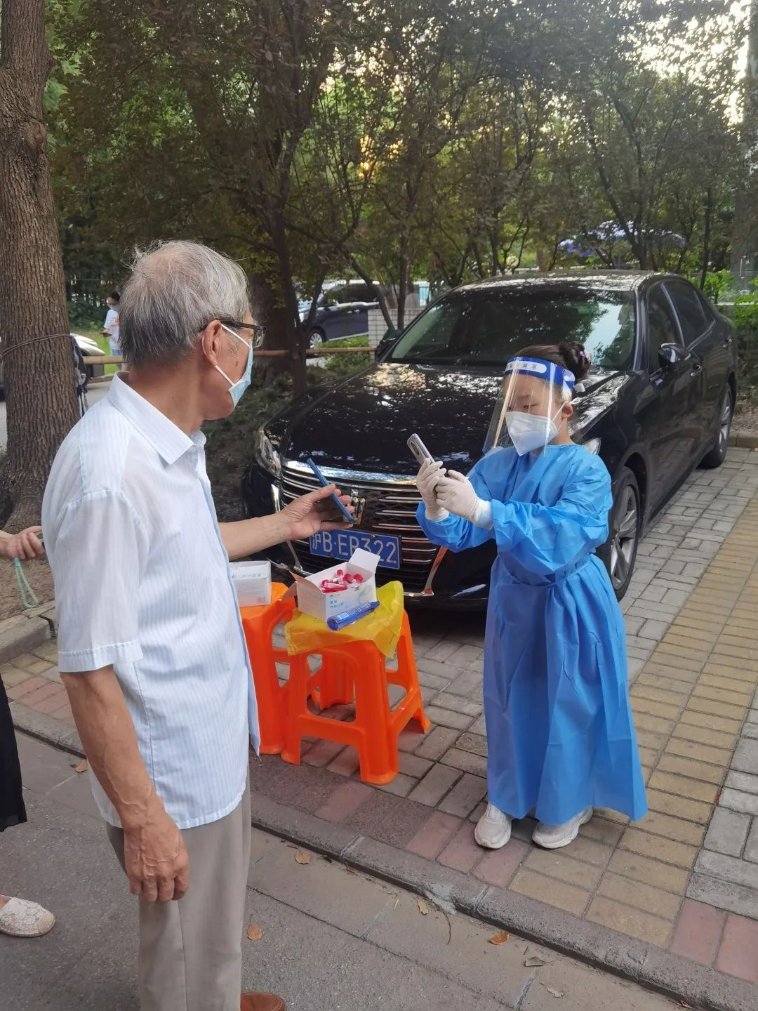 还有不少孩子当起了核酸检测“小助手”,为抗疫贡献自己的力量。穿上了“小蓝”防护服,戴上医用手套、防护面罩、N95医用口罩……三(4)班的小女孩武文景跟着妈妈体验了一次志愿者。她担任的是扫码员,用手机帮助大家录入核酸码信息。十几分钟后,她的后背就全湿透了,连防护面罩上也都是汗水。“虽然很辛苦,但也让我想到了那些一直为大家服务的‘白衣天使’更加辛苦。”武文景说。