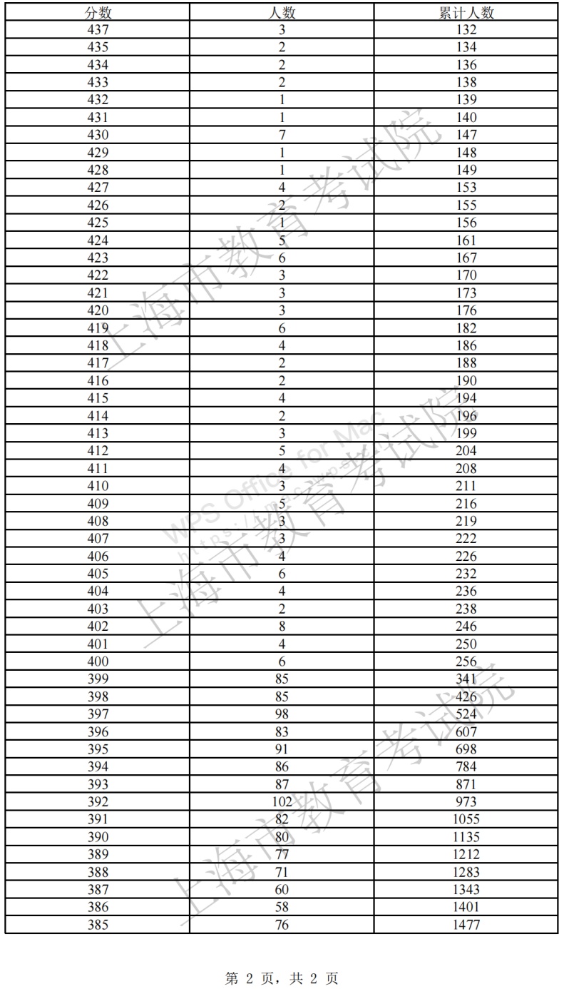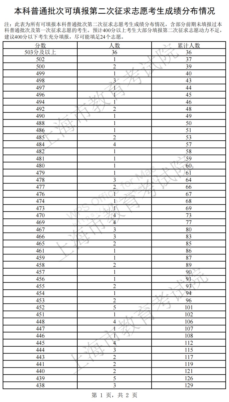高考总分在本科普通批次第二次征求志愿降分控制线上(385分及以上)的未录取考生可登录“上海招考热线”网站填报第二次征求志愿(具体填报办法详见文末)。市教育考试院已在“上海招考热线”网站公布了“本科普通批次第二次征求志愿院校专业组缺额计划表”(点击“阅读原文”查看),认可降分录取的院校专业组已在缺额计划表中独立呈现。市教育考试院还提供了“本科普通批次可填报第二次征求志愿考生成绩分布表”(详见文末),用以填报参考。根据第一次征求志愿填报情况,预计大部分400分以上考生填报第二次征求志愿动力不足,建议400分以下考生充分填报,尽可能填足24个志愿。