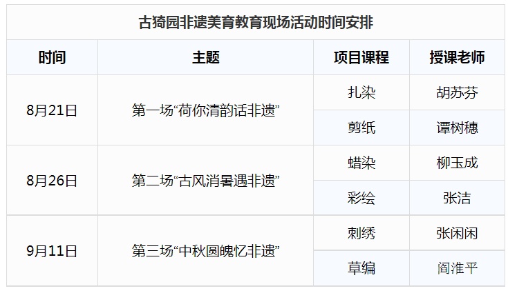 本次活动开展内容包括扎染/剪纸/蜡染/彩绘/刺绣/草编系列非遗互动体验,由上海工艺美术职业学院终身教育学院的美育天使师资团队非遗传承教师们领携,带您共度荷香中的非遗之旅。
