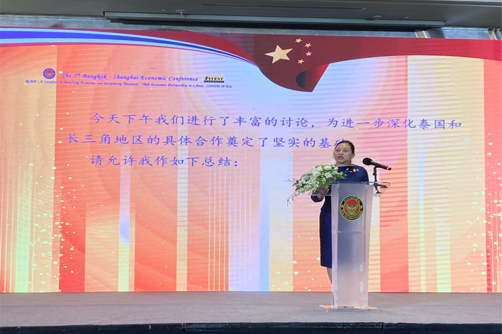 诸旖在致辞中表示,今年是中泰全面战略合作伙伴关系建立十周年,中国已连续9年成为泰国第一大贸易伙伴,双方贸易总额克服疫情影响首次突破千亿美元大关。她指出,RCEP的正式生效标志着当前世界上人口最多、经贸规模最大的自由贸易区正式启航,这将有力提振亚太区域贸易投资信心。相信随着RCEP的不断深入,沪泰双方在货物贸易、数字经济、绿色低碳等领域将会有更多的合作机遇。乐达·普玛表示,泰国和长三角应强化RCEP的有效落实,注重规则的现代化、贸易的便利化。同时,应促进双方在绿色技术、人工智能、物联网、大数据、智慧城市和先进农业等领域的投资合作,加强对劳动力的技能培训,推动人力资源开发。她表示,希望泰国和长三角能够共同努力,利用好彼此的相对优势,实现资源互补。