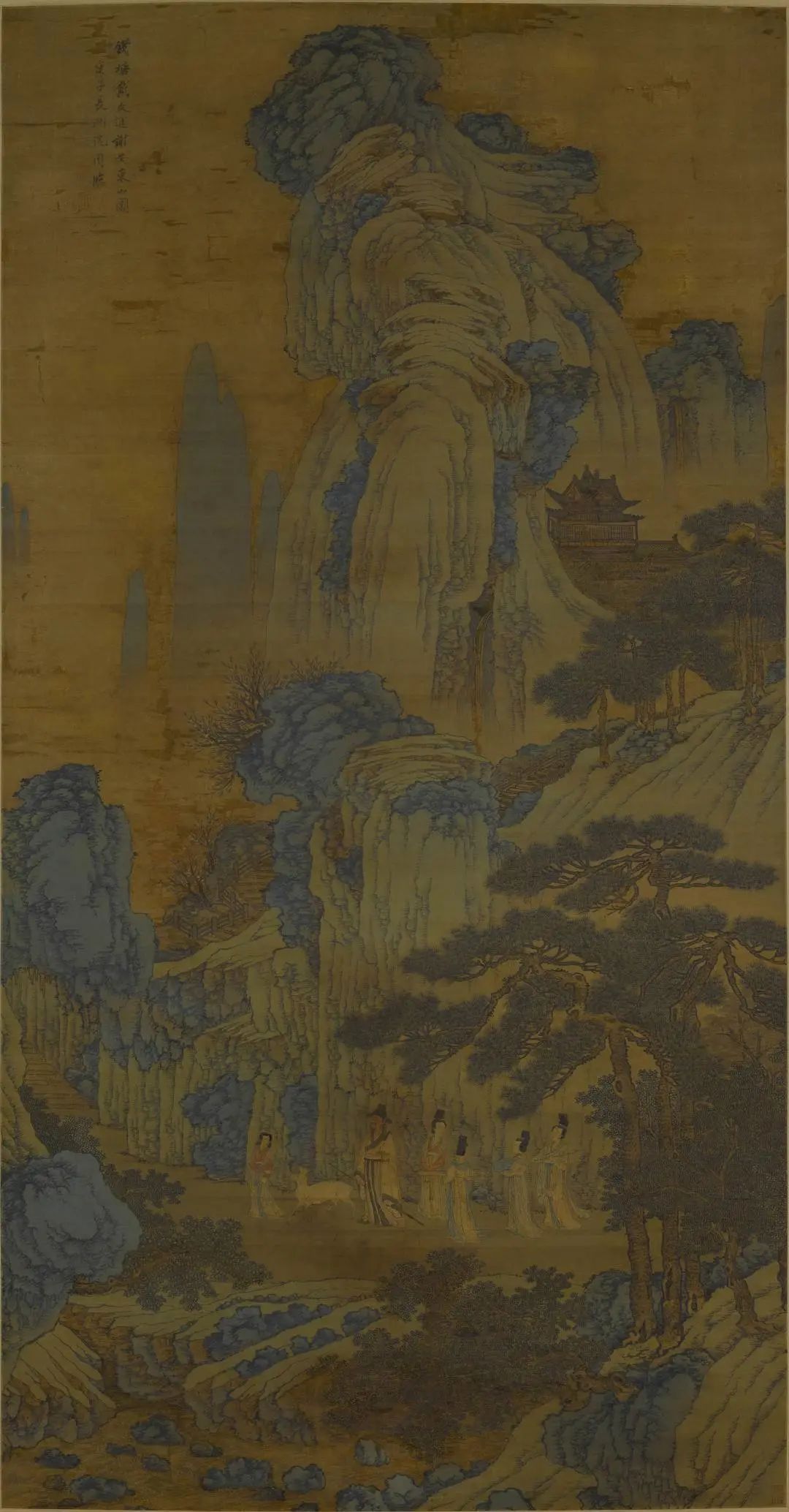 沈周的山水画,师法元代黄公望与吴镇,远溯五代董源、巨然,而戴进宗法的是南宋马远、夏圭,以风格而论,一为南方山水和水墨画的传统,一为北方山水与宫廷著色画的传统。沈周画多仿元人,其一生所作山水,多为水墨,亦有浅绛。如此大轴青绿,真是罕见罕见!