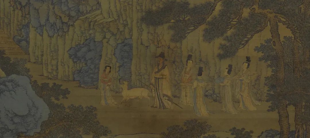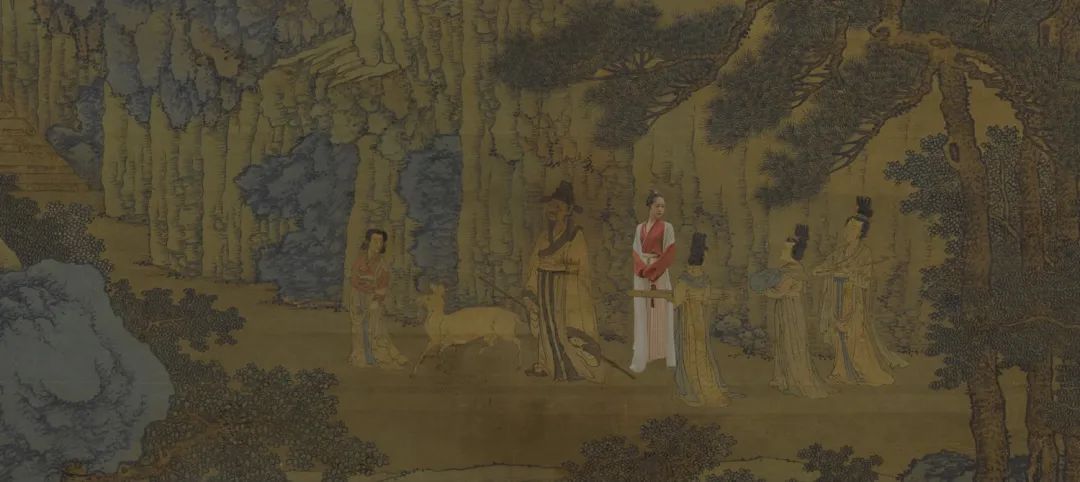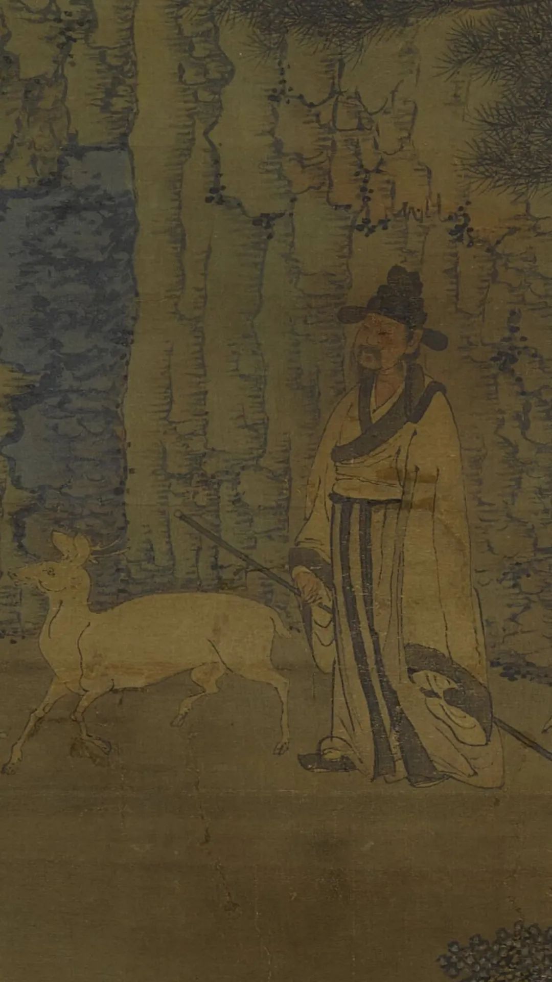 画中峰高林密,危磴通幽,乔松曲涧旁,青山碧岩下,谢安引白鹿,携名妓徜徉悠游,名士之风尽显。