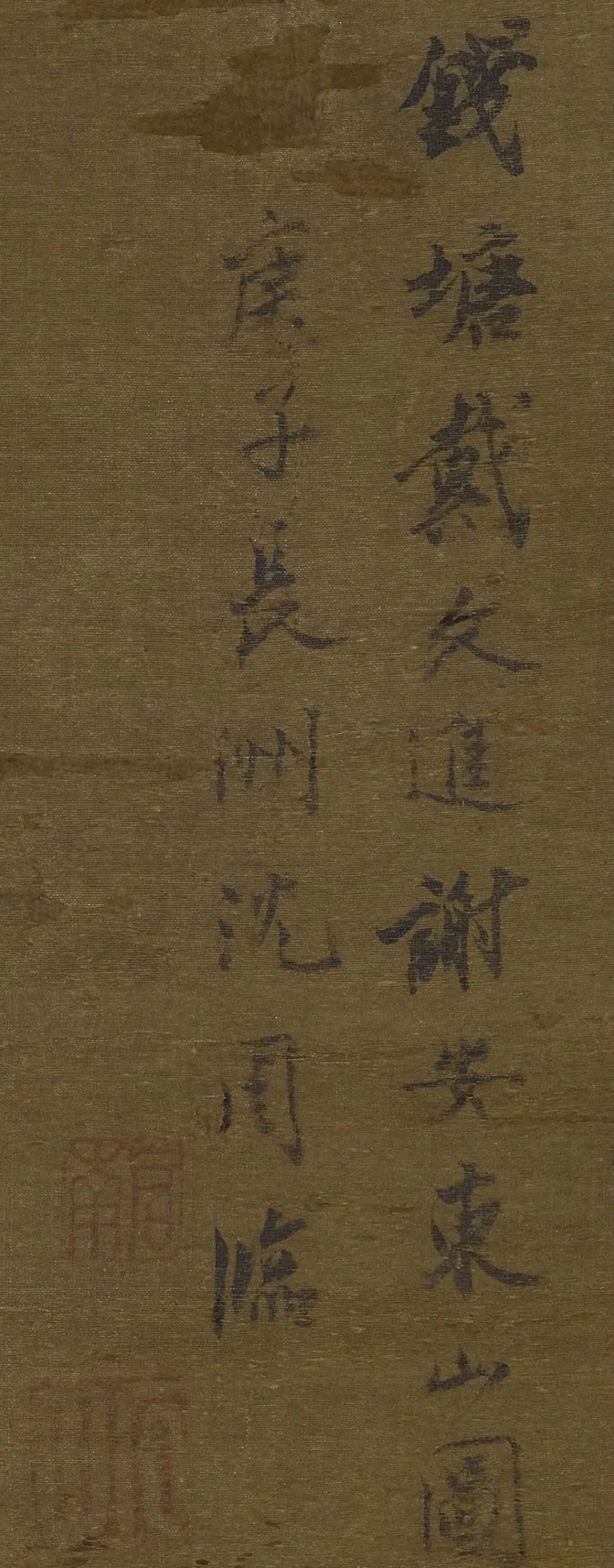画面左上有两行沈周简短的提款:“钱塘戴文进谢安东山图,庚子(1480)长洲沈周临”。题记的意思表达得很清楚:原有戴进所作的一幅《谢安东山图》,沈周见到后将此画临摹下来,款后钤有沈周的二方常见印章“启南”“石田”。