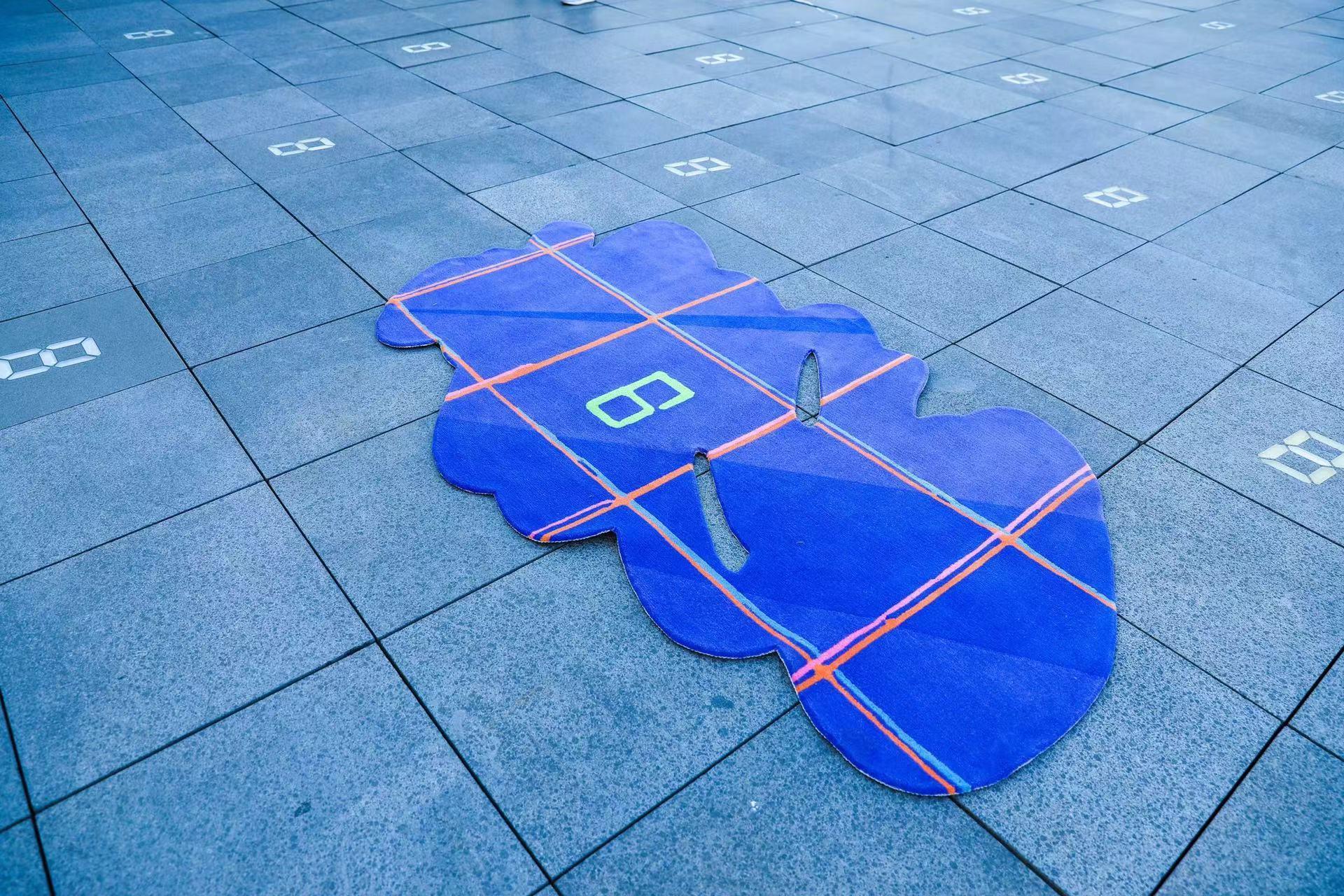 与展览同期进行的空间情境表演更为直白地延续了艺术家在现实生活中还原数字化模拟的实验。在复星艺术中心的天台咖啡厅一角及天台地面上,刘毅结合想象与现实进行的写生绘画在原地被如“实”还原,贯穿艺术家标志性荧光色彩(同时也是电子屏幕中最为常见的色彩)的“虚空间“与真实空间相重叠,诞生于电子屏幕的笔触被赋予绒面地毯的温暖质感。现场的表演也进一步打破了真实与虚拟的界限。