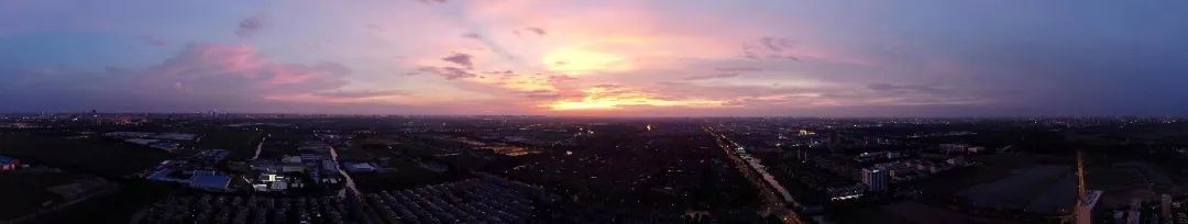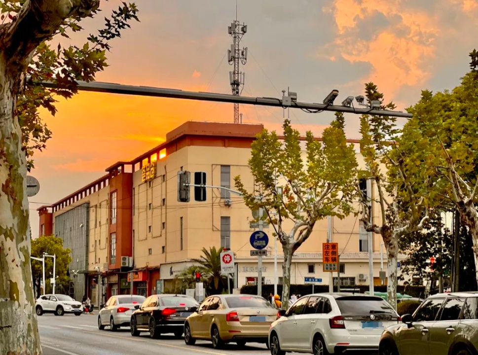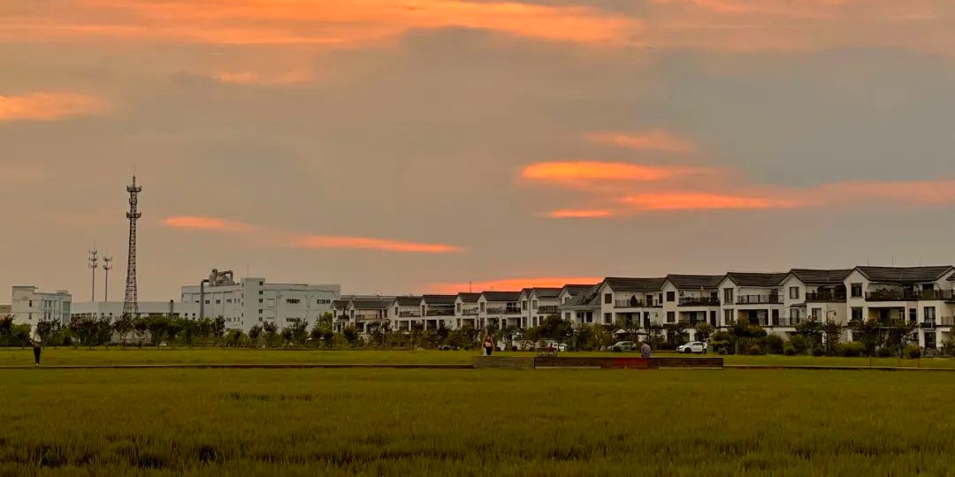 傍晚时分,安亭镇向阳村的整侧天域燃烧着温暖的橘红色火焰,将乡村晕染出柔和明亮的光。街道上熙熙攘攘,到处散发着恬静柔和温馨舒适的光芒。