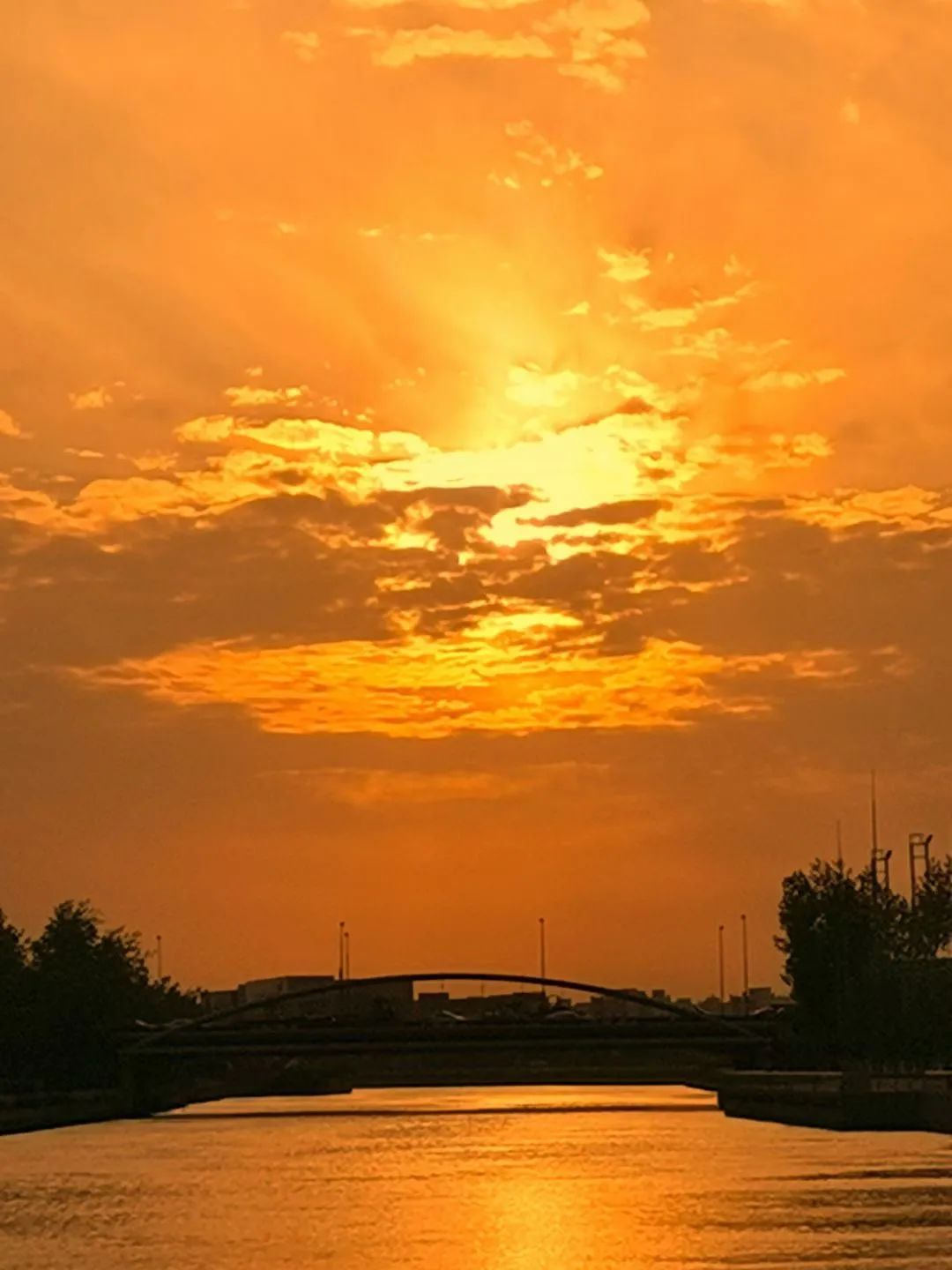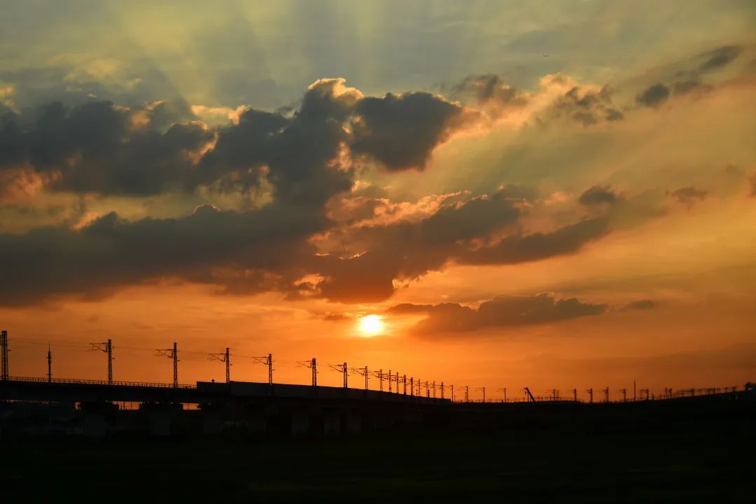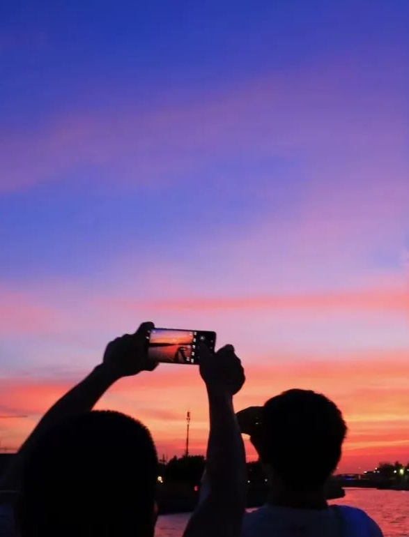 阳光在云层中不断变换色彩,淡金、橙黄、火红,霞光洒下,波光粼粼,天色与河面,融成一片迷人的景色。