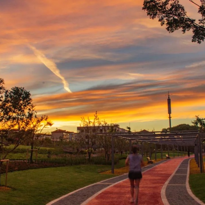远香湖的健身跑道上,人们三两结伴,追着太阳前行,把烦恼都丢进夕阳里,和星星一起沉沦。