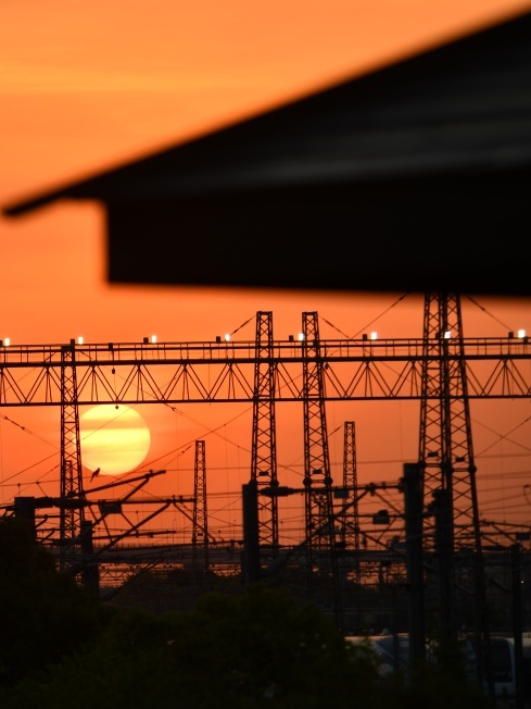 嘉洲公园的凉亭乘机与太阳玩起“捉迷藏”,憩息片刻的飞鸟与远处西沉的落日相映成趣,颇有“飞鸟相与还”的韵味。葱茏的绿荫、别致的凉亭设计,与远处的沿线铁轨,共同打造天然的构图场景。