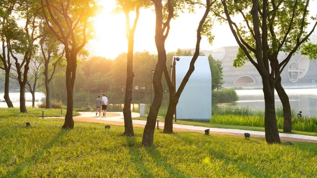 夜幕低垂,清晰而明艳的夕阳轮廓渐渐消失退散。在余晖光影的点缀下,清如明镜的宽阔湖面充满灵动生气,远处的村落人家仿佛披上红纱,园内郁郁葱葱的林木被晕染开来,令人如痴如醉。