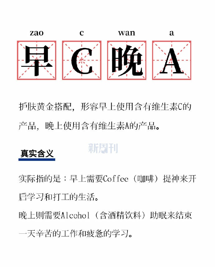 近年来,网上兴起一个新名词:“早C晚A”,意思是早上喝一杯咖啡(Coffee)提振精神,晚上来点酒精饮品(Alcohol)放松身心。而“早C晚A”似乎也成了越来越多年轻人的“续命公式”。