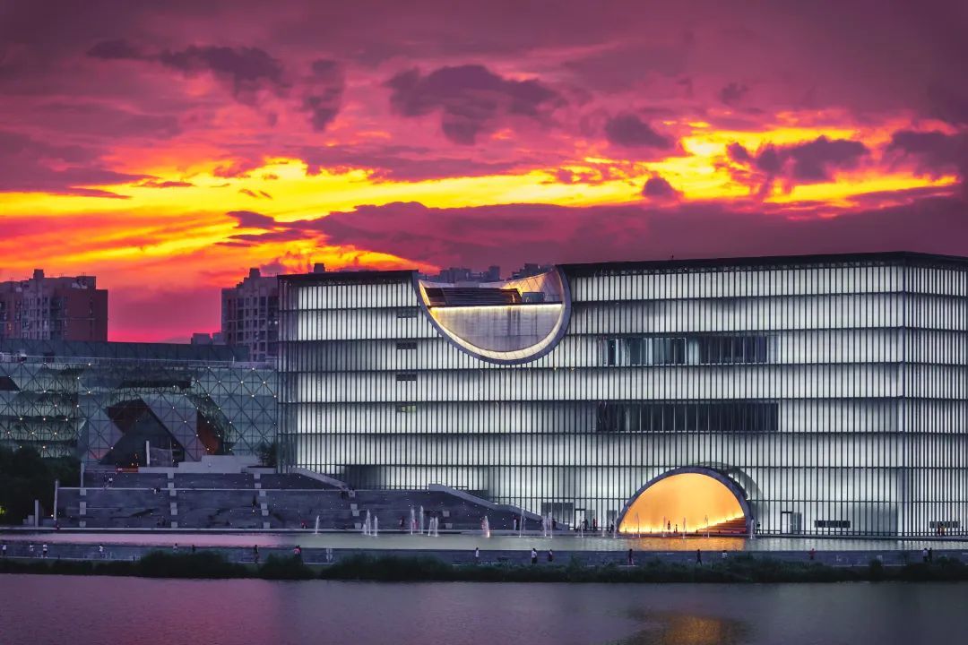 日落尤其温柔,夕阳尽是不舍,它把碎金投射在保利大剧院的外墙上,伴着缓慢优雅的脚步,在外墙上舞上一段灵动跳跃的恋歌。漫天的火烧云染得一片红晕,保利大剧院就静静地守在湖边冥想。在参差不齐的建筑中央,在树梢旁、在湖水间、在晚风里,夕阳与周围的一切相得益彰,构成一幅美轮美奂的画卷。