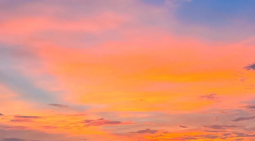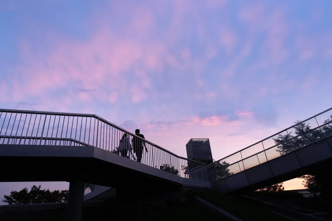 残阳倒映在栏杆上,过往的行人融入于暮色,橘粉色的晚霞映着蓝色的天空,便是无尽的梦幻与温柔绵延。日落西沉,余霞成绮;华灯初上,彩霞辉映。想扯下一束光,制成书签,好好珍藏。