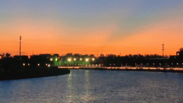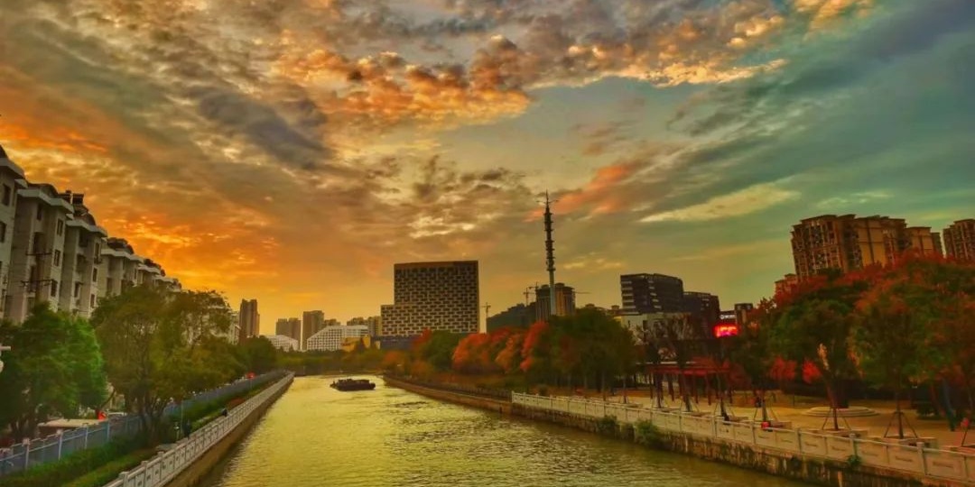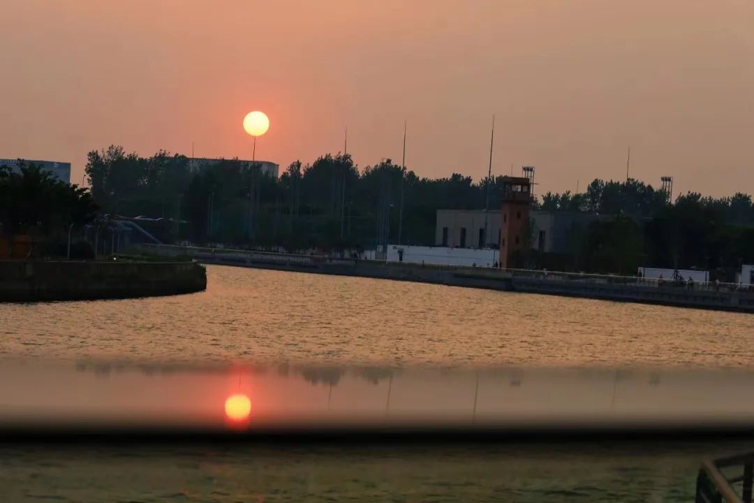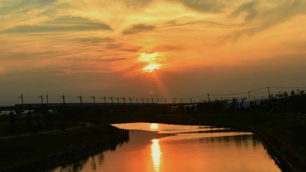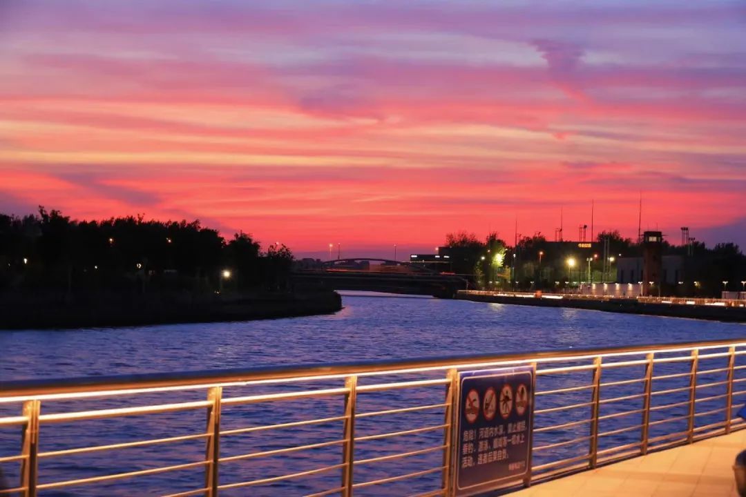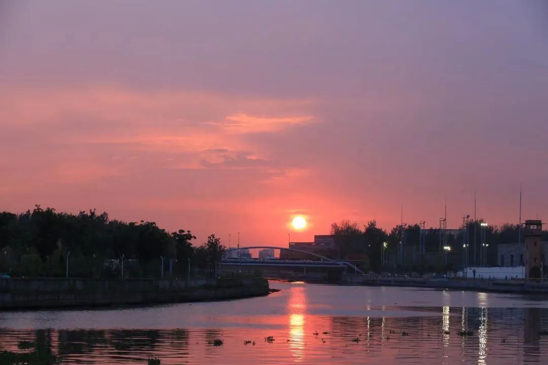 阳光在云层中不断变换色彩,淡金、橙黄、火红,霞光洒下,波光粼粼,天色与河面,融成一片迷人的景色。