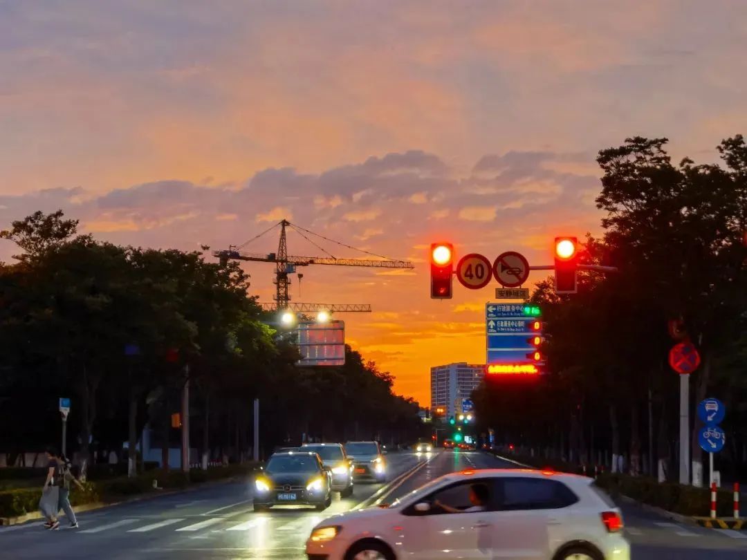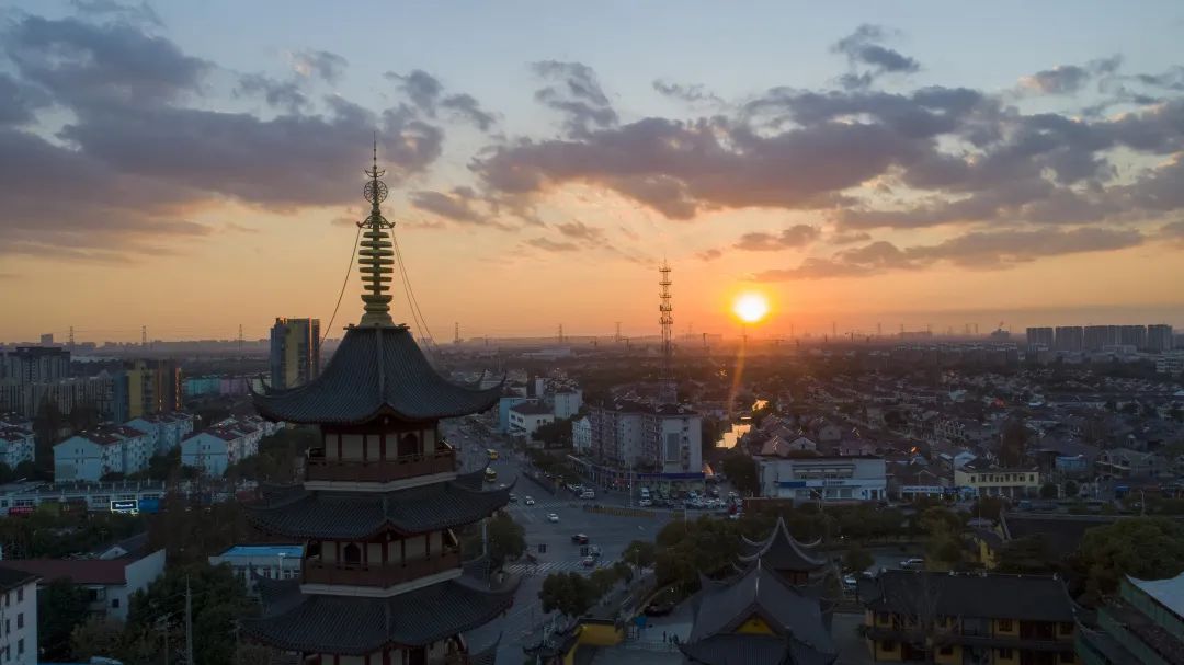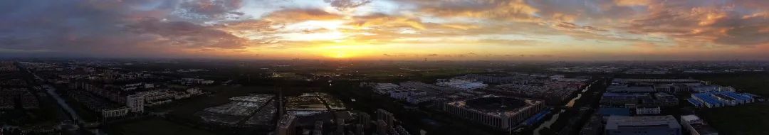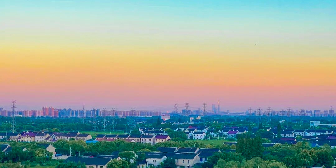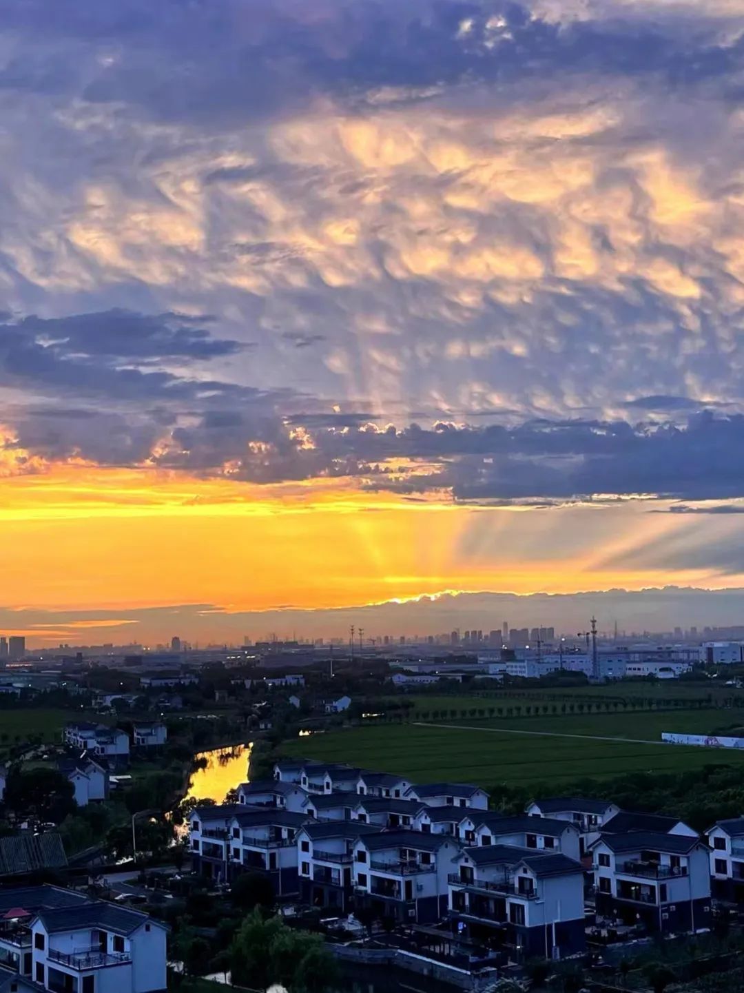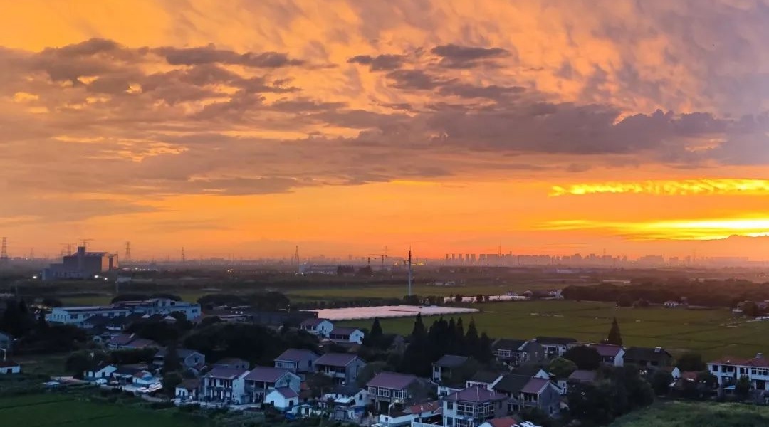 傍晚时分,安亭镇向阳村的整侧天域燃烧着温暖的橘红色火焰,将乡村晕染出柔和明亮的光。街道上熙熙攘攘,到处散发着恬静柔和温馨舒适的光芒。