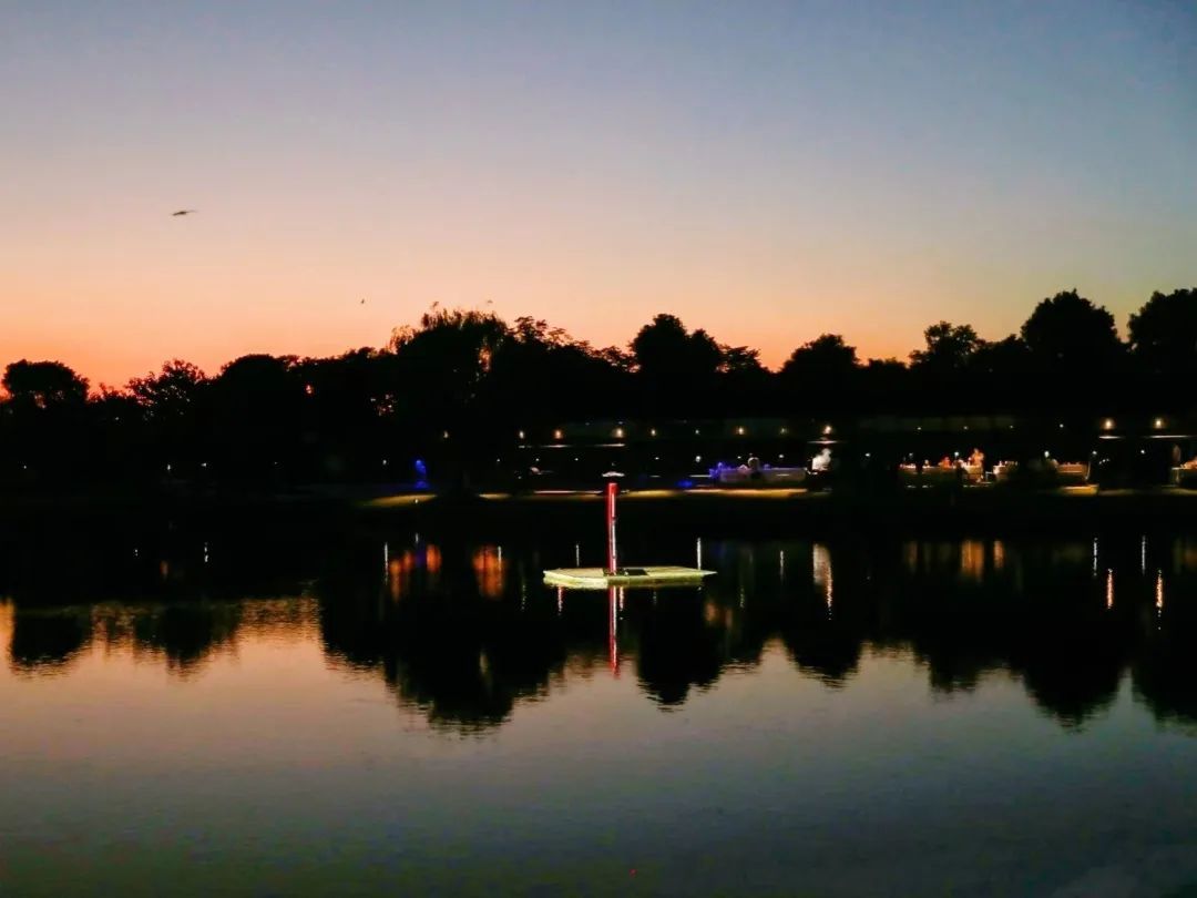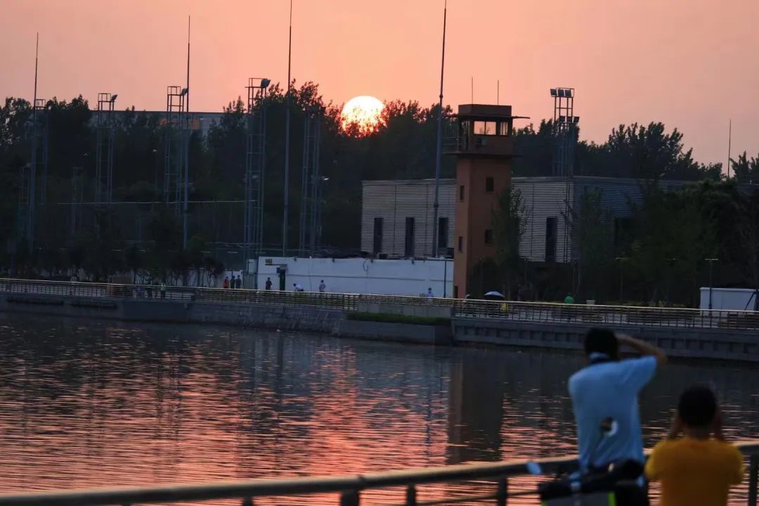 夜幕低垂,清晰而明艳的夕阳轮廓渐渐消失退散。在余晖光影的点缀下,清如明镜的宽阔湖面充满灵动生气,远处的村落人家仿佛披上红纱,园内郁郁葱葱的林木被晕染开来,令人如痴如醉。
