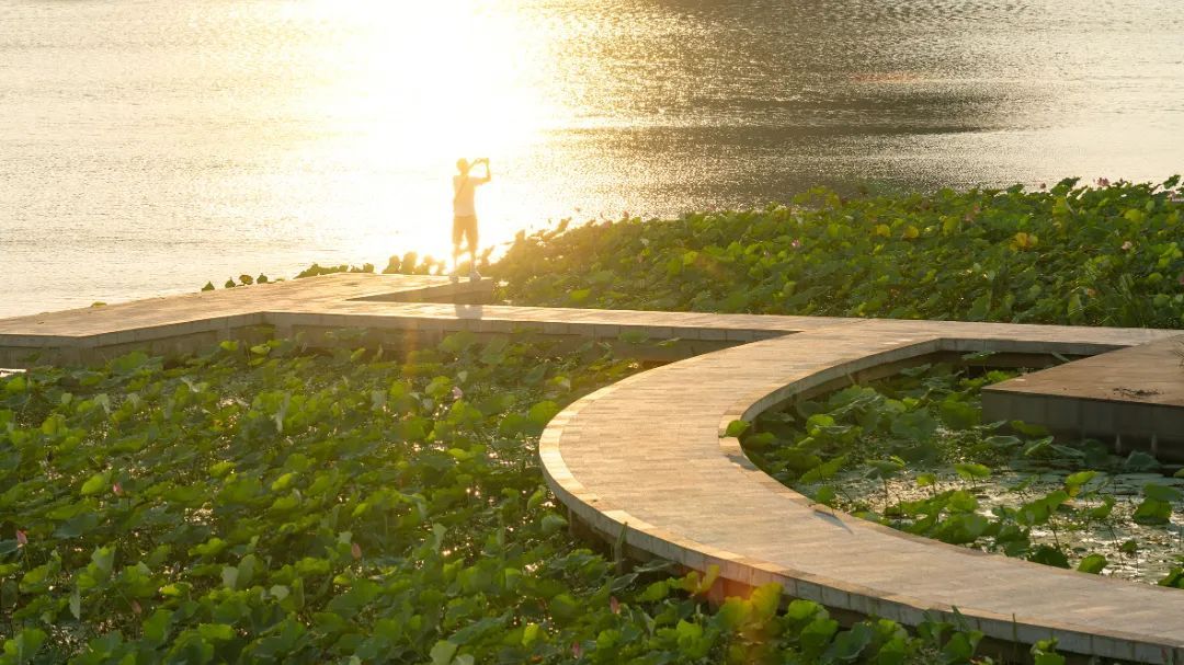 远香湖的健身跑道上,人们三两结伴,追着太阳前行,把烦恼都丢进夕阳里,和星星一起沉沦。
