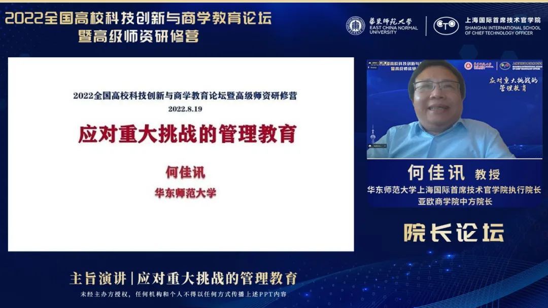 华东师范大学上海国际首席技术官学院执行院长、亚欧商学院中方院长何佳讯教授作了题为“应对重大挑战的管理教育”的主旨演讲。何佳讯将商学教育和背后的管理研究结合在一起进行分析,从指出当前中国商科优秀生普遍存在的问题开始,指出其背后形成的可能原因,并提出要高度重视创造力、领导力、价值导向三点建设性意见。
