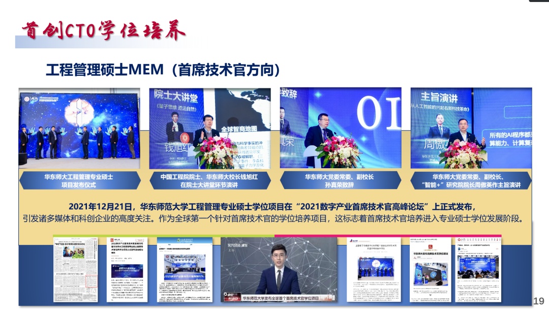 为此,华东师范大学成立了上海国际首席技术官学院,使命是“通过人和技术的协同转化实现科技的社会价值”,开创“科技+”和“商学+”交叉学科建设,创立金字塔型卓越育人逻辑和“4+X”全新课程体系,融合“科学家精神”和“企业家精神”,培养首席技术官和未来科技型战略企业家。聚焦产教融合与学科交叉融合,统筹校内外、国内外资源,实施“三导师”制,打造国际一流的导师队伍。