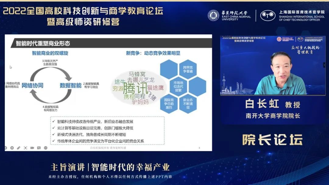 南开大学商学院院长白长虹教授作了题为“智能时代的幸福产业”的主旨演讲。他以“智能时代的管理研究”“元宇宙与幸福产业”“文旅产业提升国民幸福指数研究”三个专题向与会者介绍了何为智能时代的幸福产业。