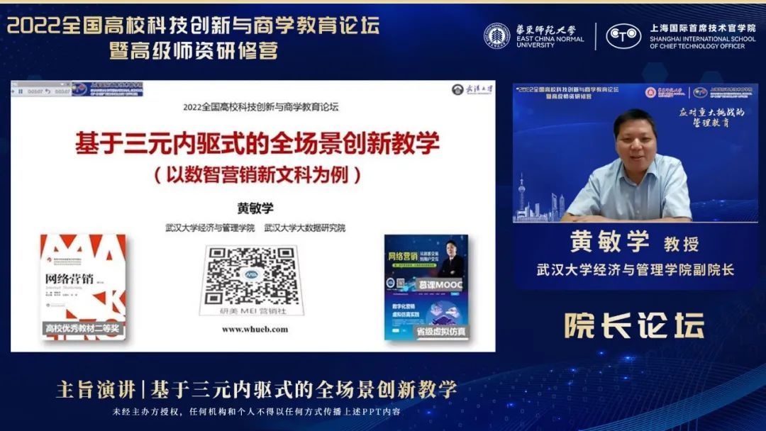 武汉大学经济与管理学院副院长黄敏学教授作了题为“基于三元内驱式的全场景创新教学”的主旨演讲。他从数智时代营销与技术的关系、营销岗位能力要求变化、营销人才培养模式创新,层层递进,为与会人员介绍了数智时代营销专业课程体系的挑战和机遇。