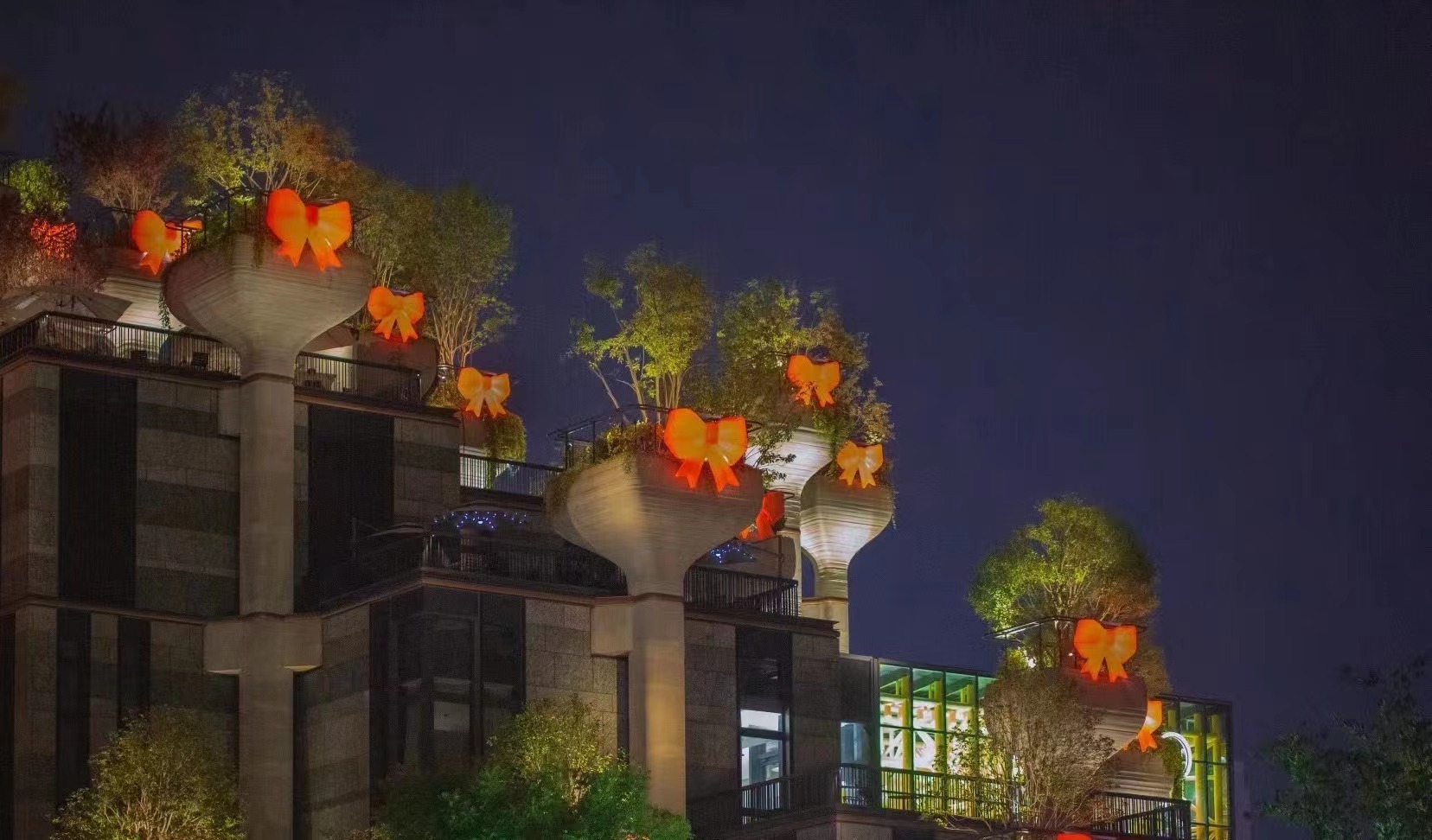 当观念艺术家托马斯·迪曼德来到千树遇上设计鬼才托马斯·赫斯维克,“现实幻想者“和“最性感的大脑”的灵魂共振, 幻化成独特的城市景观,在上海苏州河畔绘制焕然一新的别样风景。百结千树大型景观项目不但是中国领先艺术机构与先锋时尚商业综合体共同携手,对构建城市多元文化生态,打造社区愉悦生活体验的一次大胆尝试,同时也是艺术与建筑碰撞融合,诞生全新的生命活力的诠释。一场城市中的蝴蝶结狂想,让我们思考艺术如何动态适应城市环境、空间和形态的需求,促进上海公众艺术的发展提供了全新视角。