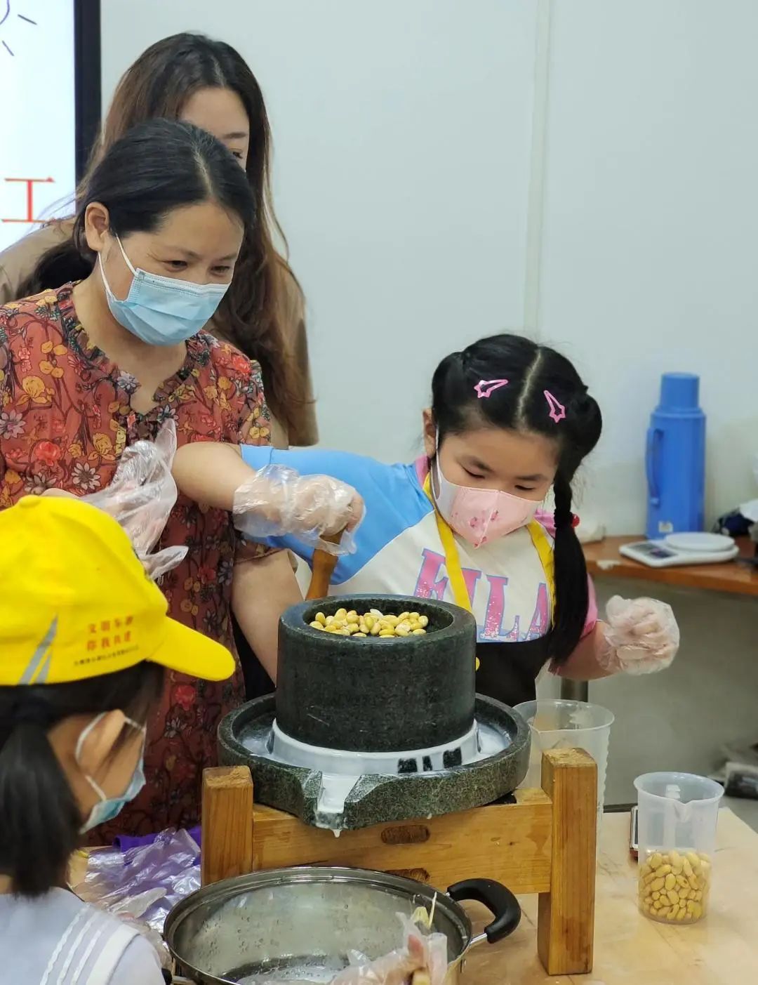 “豆花很好吃,真没想到原来它是从一粒粒小黄豆变过来的!”听了老师的讲解和演示,刘乐天惊讶地说。“三人一组,磨豆子、滤豆渣、点豆腐,只需要三步豆花就‘变’出来啦!”在科普老师的引导下,孩子们三人一队相互配合,将黄豆倒在石磨顶上,一边慢慢推磨一边缓缓加水,没一会儿,白色的豆汁便从石磨底部的凹槽里流出。豆汁磨好后装入纱布袋进行过滤,再倒进小锅煮沸后,加入内酯“点”一下豆汁后,小朋友们便满怀期待地等待豆花形成。看到锅底豆花逐渐成型,一碗碗舀起自己亲手做的豆花,又惊又喜的孩子们来到调料台前,简单地“添油加醋”一番,便得到了一碗“独一无二”的豆花小吃。