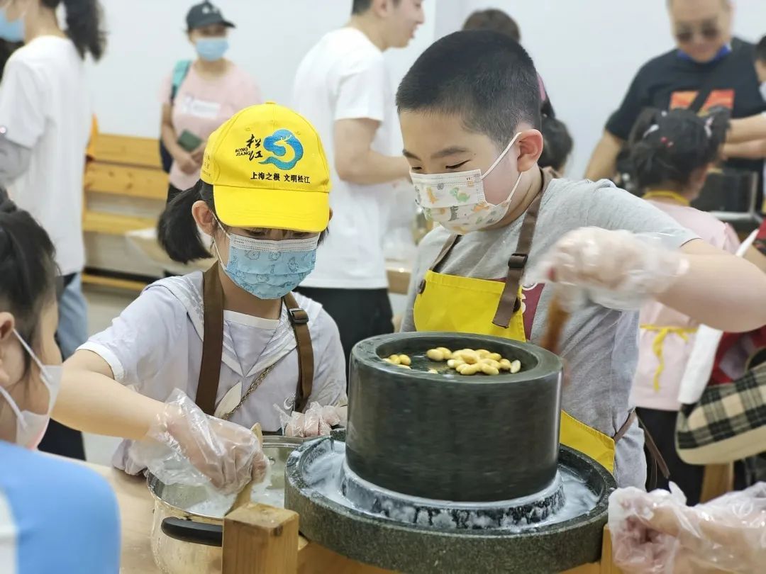一小碗泡发的黄豆,经过石磨研磨,巧手一“点”便成为一碗豆花。8月17日上午,岳阳街道金沙滩居民区的小朋友们来到上海农林职业技术学院五厍实训基地,亲手磨豆子、点豆花,在科普老师的带领下体验了一把“古法豆花”制作的传统技艺。