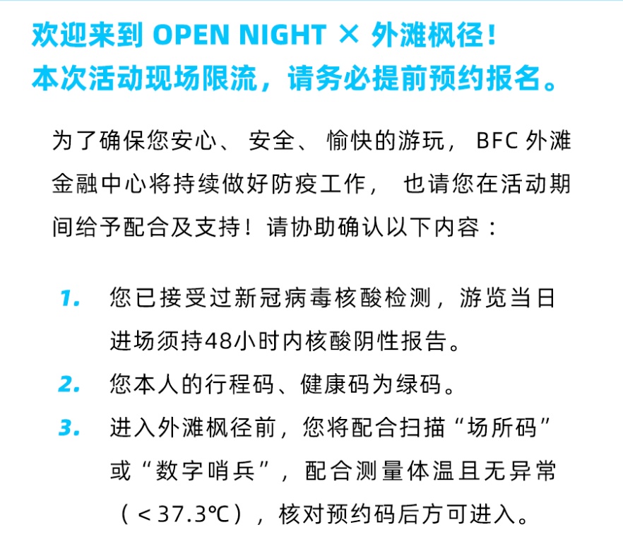 在防疫方面,BFC外滩金融中心严格遵守相关要求,市民需通过“BFC外滩金融中心”公众号成功预约后,在现场出示48小时内核酸阴性证明方可进入。