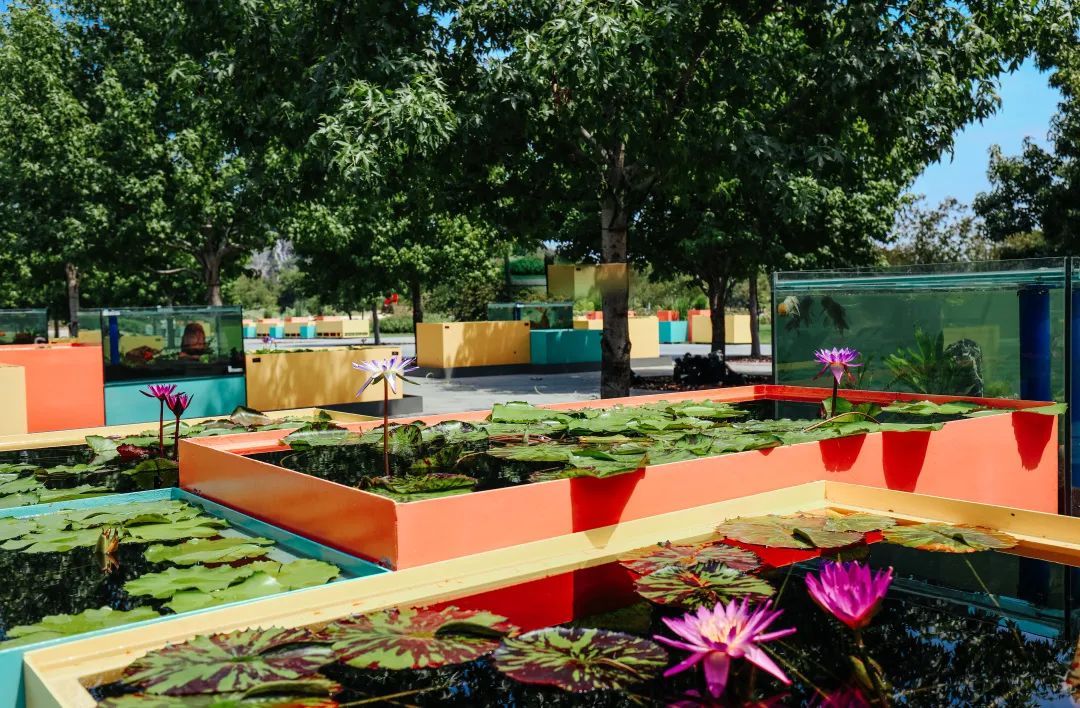 在1号门入门林荫广场上,由柚柚橙、酪酪黄、冰冰绿组成的绮炫“棒冰”色系容器搭配组合,清透沁凉的鱼缸穿插于在氤氲水雾间,花影间“人静鱼自跃”,形成的精品睡莲展示区,在酷暑难耐之际带来无限清凉体验。